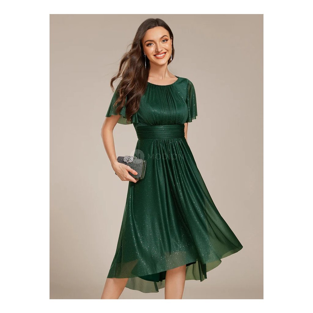Zelené společenské šaty v midi délce působí svěže, přirozeně a slavnostně. Jemný zelený odstín v kombinaci s decentním třpytivým efektem dodává modelu lehký lesk, který krásně vynikne při pohybu i večerním osvětlení.