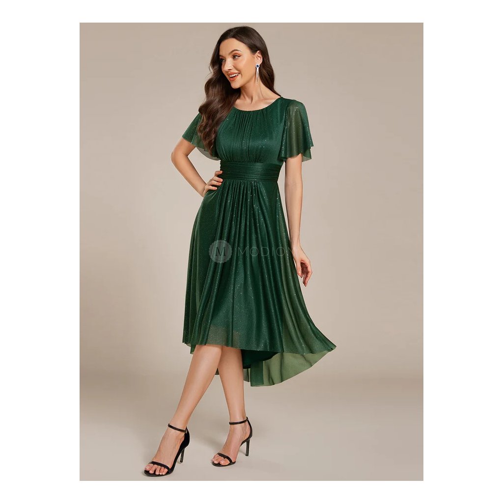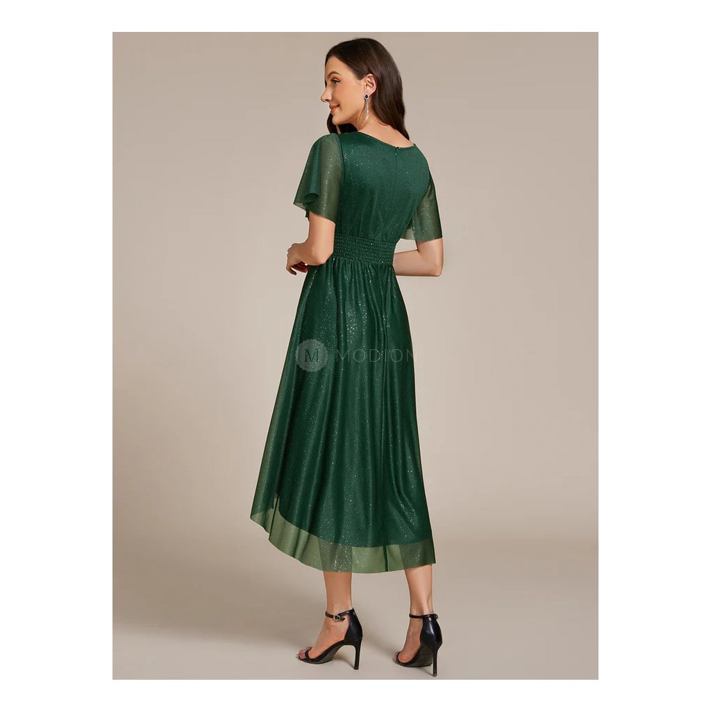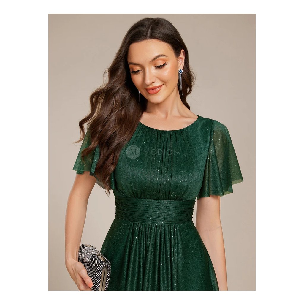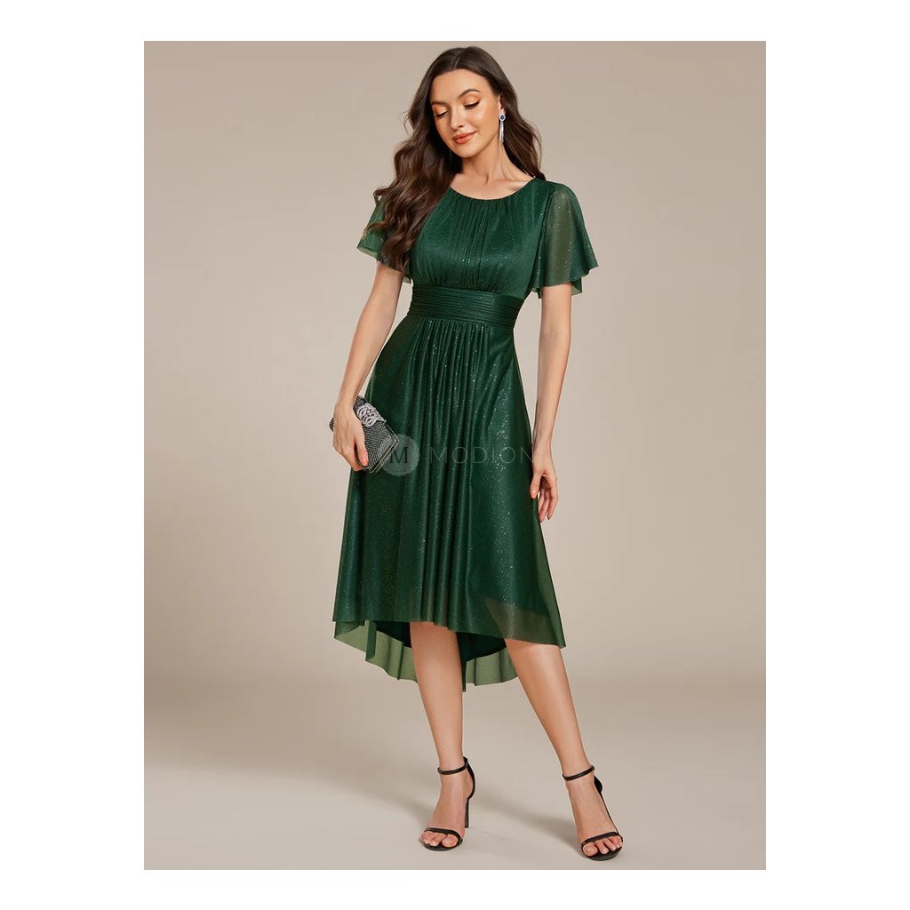 Tmavě zelené smaragdové společenské šaty z lehkého šifonu působí luxusně a výrazně. Krátké rukávy z jemného materiálu dodávají vzdušnost, kulatý výstřih s plisováním přidává šatům půvabný detail. Sukně s asymetrickým střihem – vpředu kratší a vzadu midi – se při chůzi ladně nese. V pase šaty lichotivě tvarují postavu a na zadním díle mají praktické žabičkování, které se přizpůsobí a zajišťuje pohodlí při nošení.