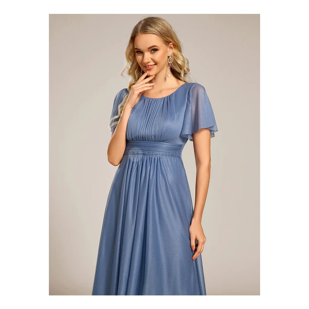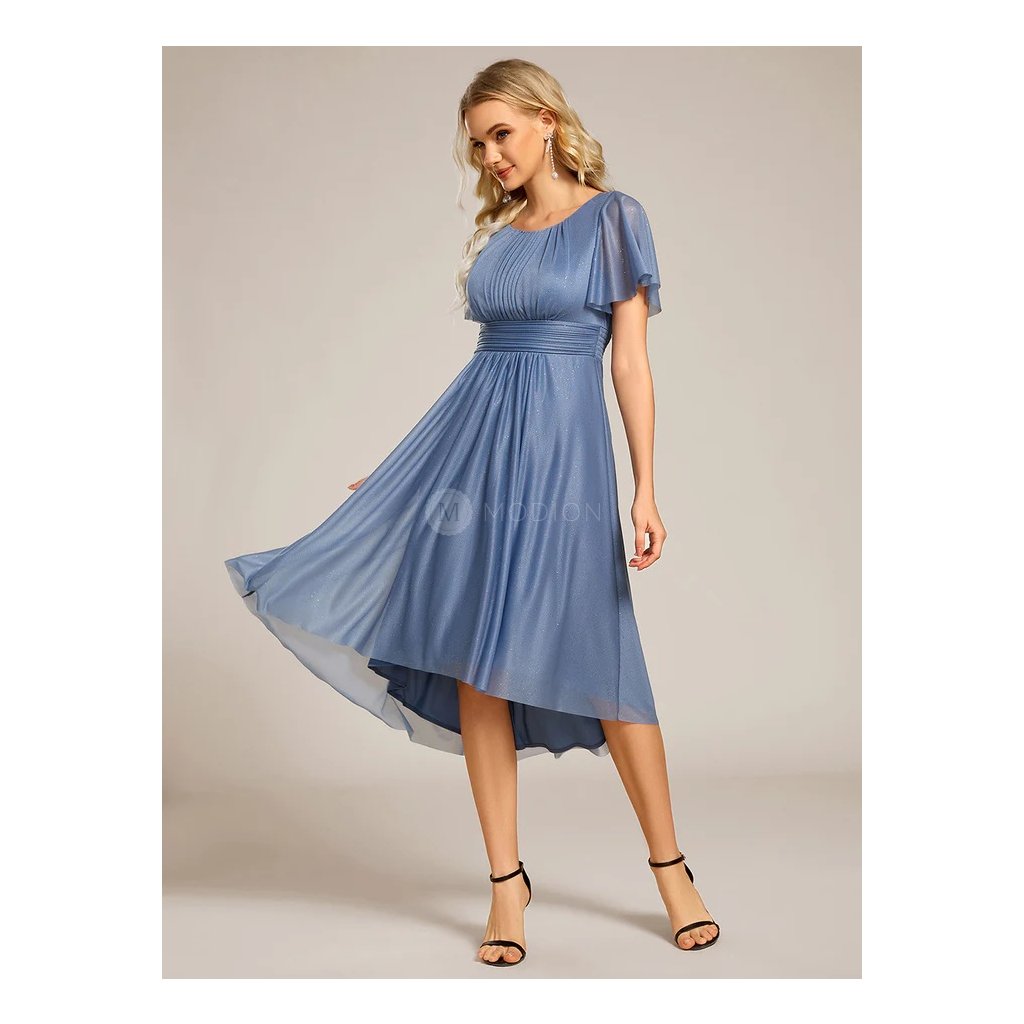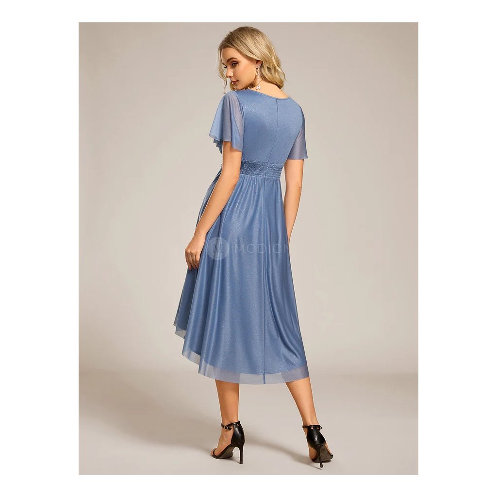 Modrošedé společenské šaty z lehkého šifonu působí decentně a vkusně. Krátké rukávy z jemného materiálu dodávají lehkost a kulatý výstřih s plisováním působí půvabně. Přední část sukně je kratší, zadní v midi délce, zatímco jemný třpyt materiálu podtrhuje slavnostní vzhled. V pase šaty lichotivě tvarují postavu a na zadním díle mají praktické žabičkování, které se přizpůsobí a zajišťuje pohodlí při nošení.