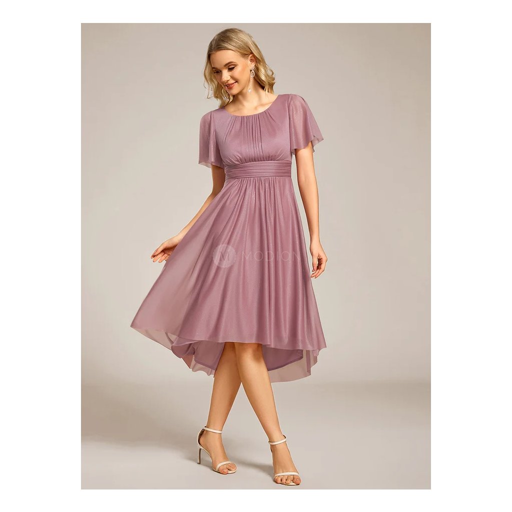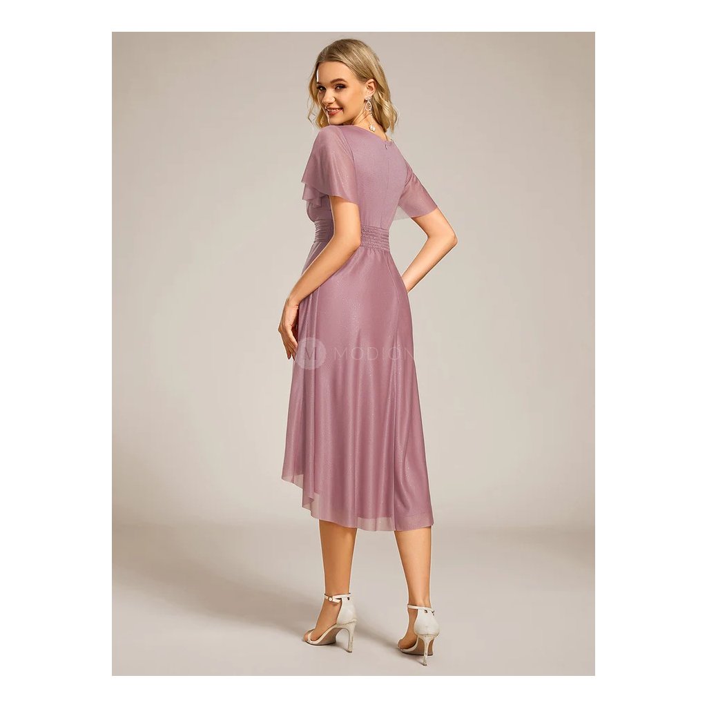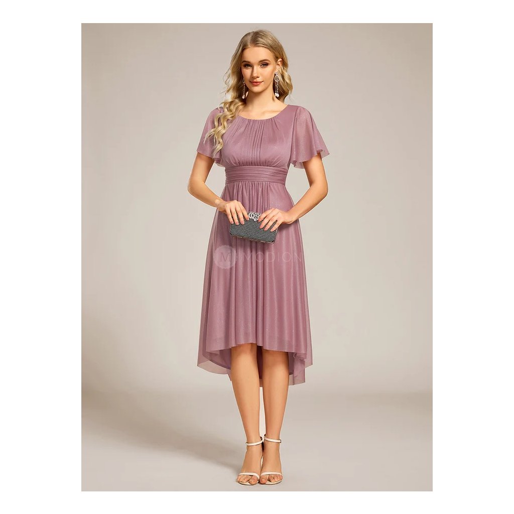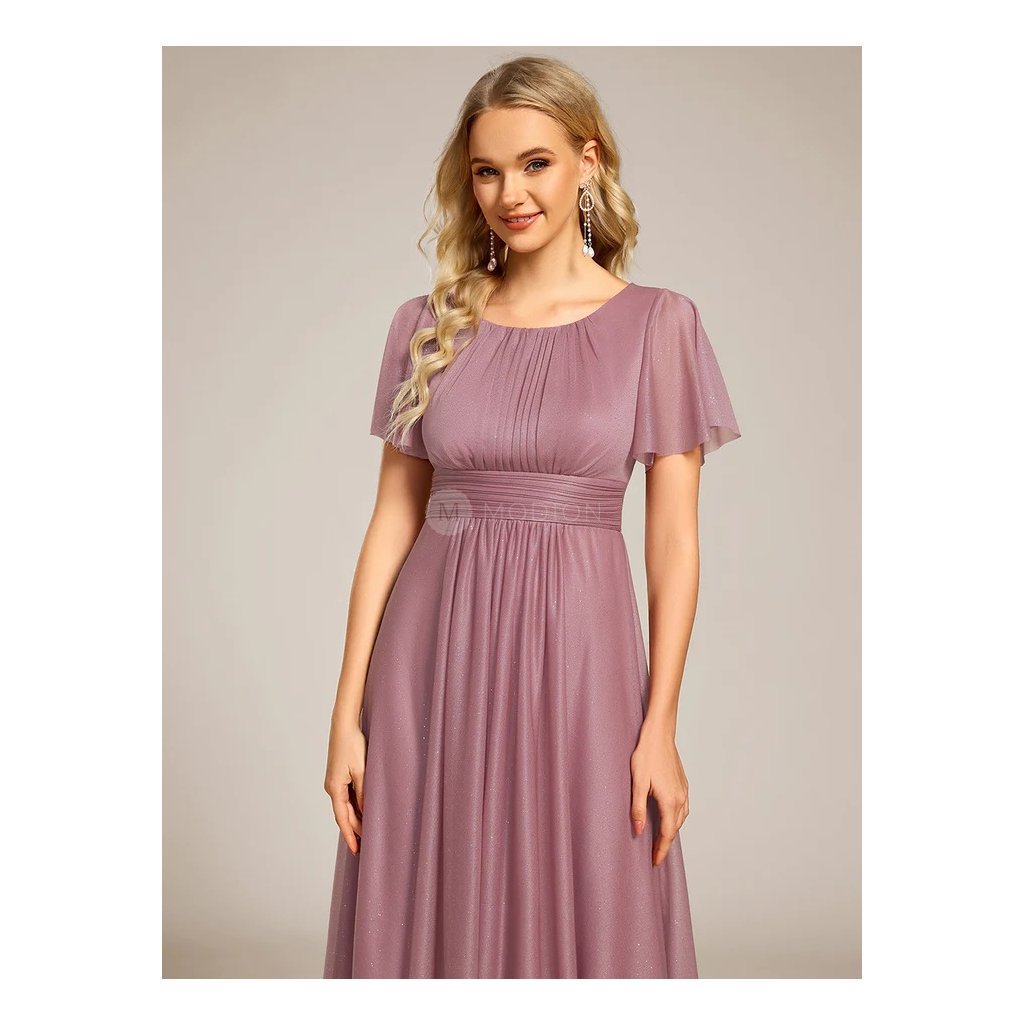 Starorůžové společenské šaty z lehkého šifonu působí romanticky a jemně. Krátké rukávy z lehkého materiálu decentně zakrývají paže, kulatý výstřih s plisováním dodává ženský půvab. Asymetrická sukně – kratší vpředu a v midi délce vzadu – podtrhuje slavnostní charakter. V pase šaty lichotivě tvarují postavu a na zadním díle mají praktické žabičkování, které se přizpůsobí a zajišťuje pohodlí při nošení.