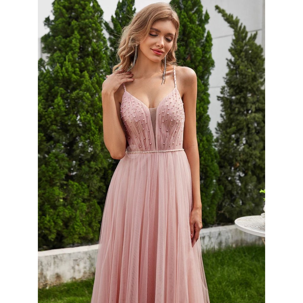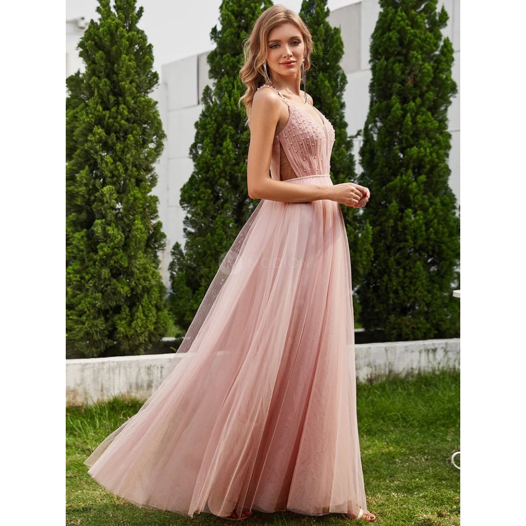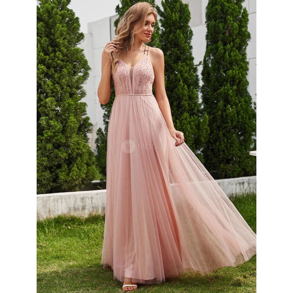 Dlouhé růžové společenské šaty v tylovém provedení s perlami v jemném růžovém odstínu působí něžně, romanticky a velmi elegantně. Světlý růžový tón dodává modelu lehkost a nadčasový slavnostní charakter, který vynikne při večerních i formálních událostech.