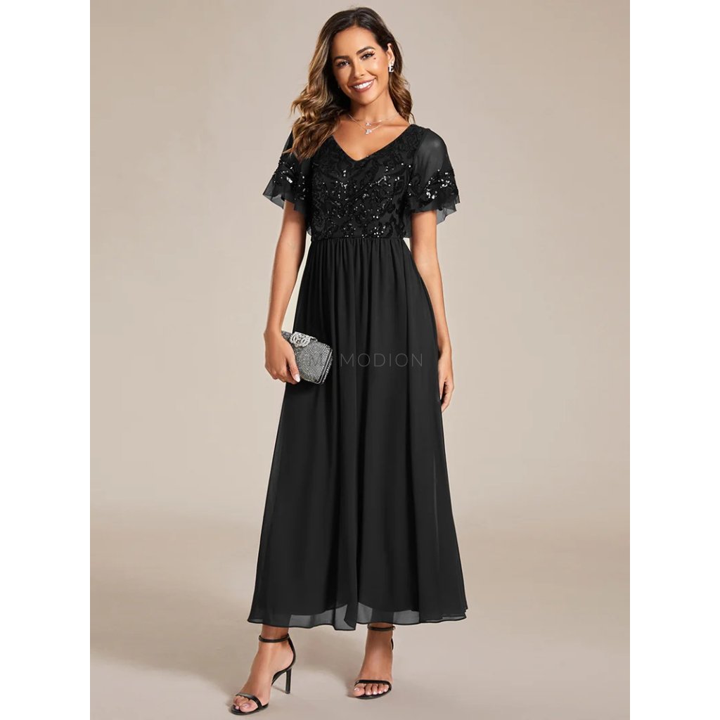 Černé společenské šaty pro maminku jsou nadčasovou klasikou. Třpytivý flitrový živůtek s krátkým rukávem a kulatým výstřihem působí elegantně a šifonová sukně se pohodlně nosí.