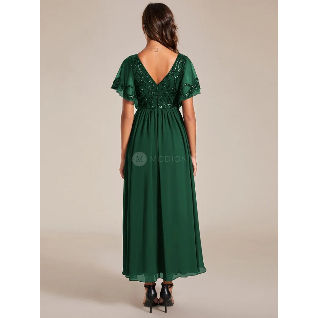 Horní část z jemného tylu s lehkým třpytem přidává šatům slavnostní nádech a jemnou strukturu, která krásně vynikne při pohybu. Krátké průsvitné, zdobené rukávy působí vzdušně a zjemňují siluetu. Výstřih do V lichotí dekoltu a opticky prodlužuje postavu. Přirozeně tvarovaný pas plynule přechází do dlouhé šifonové sukně, která se při chůzi i tanci lehce vlní a dodává modelu lehkost a ladnost. Celek působí harmonicky, žensky a velmi vkusně.