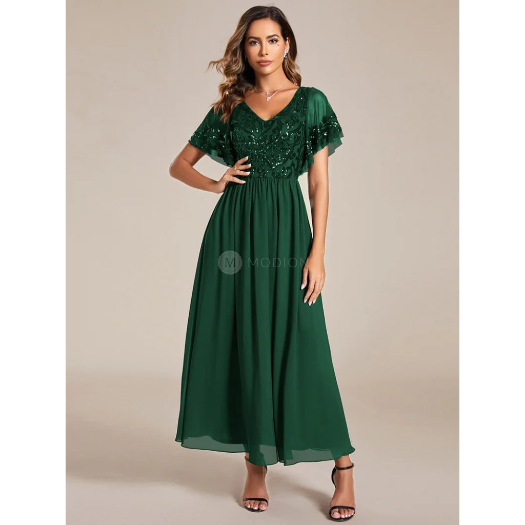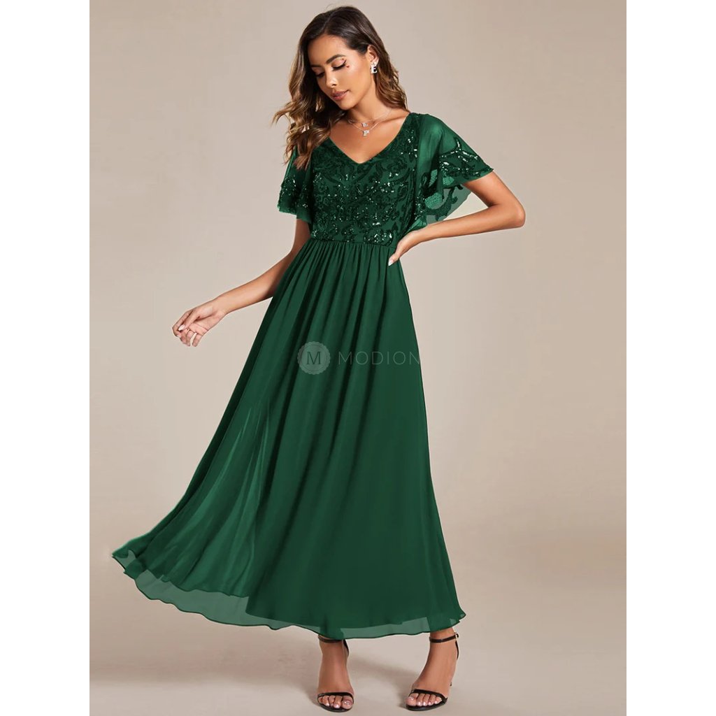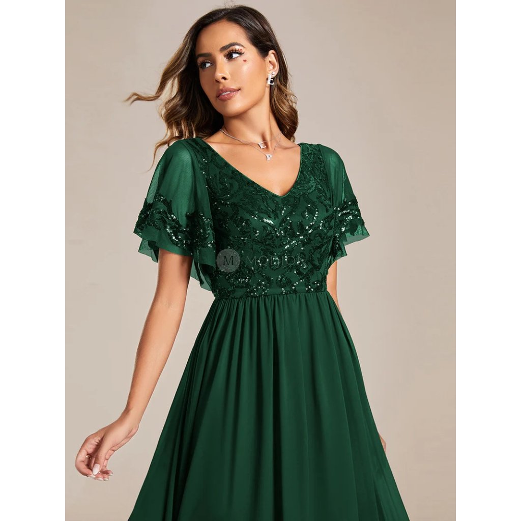 Dlouhé zelené společenské šaty v zeleném odstínu působí svěže, elegantně a velmi přirozeně. Harmonický barevný tón dodává modelu klidný a nadčasový výraz, který se snadno uplatní při různých společenských příležitostech.