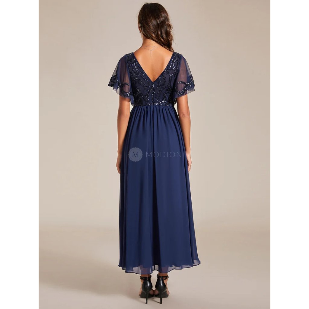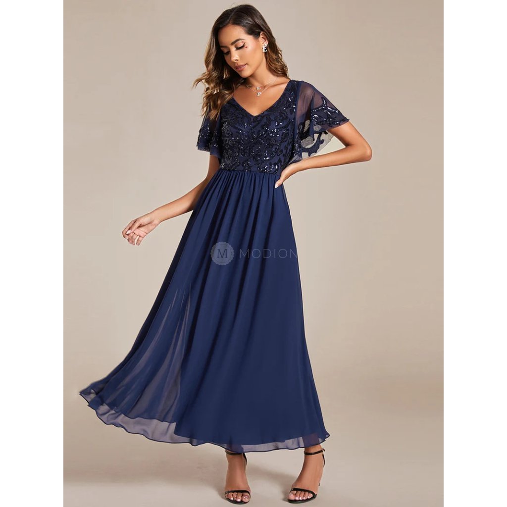Tmavě modré společenské šaty kombinují eleganci s pohodlím. Flitrový živůtek s krátkým rukávem působí slavnostně, kulatý výstřih je decentní a šifonová sukně dodává lehkost. Perfektní pro svatby, promoce nebo plesy, kde potřebujete zazářit.