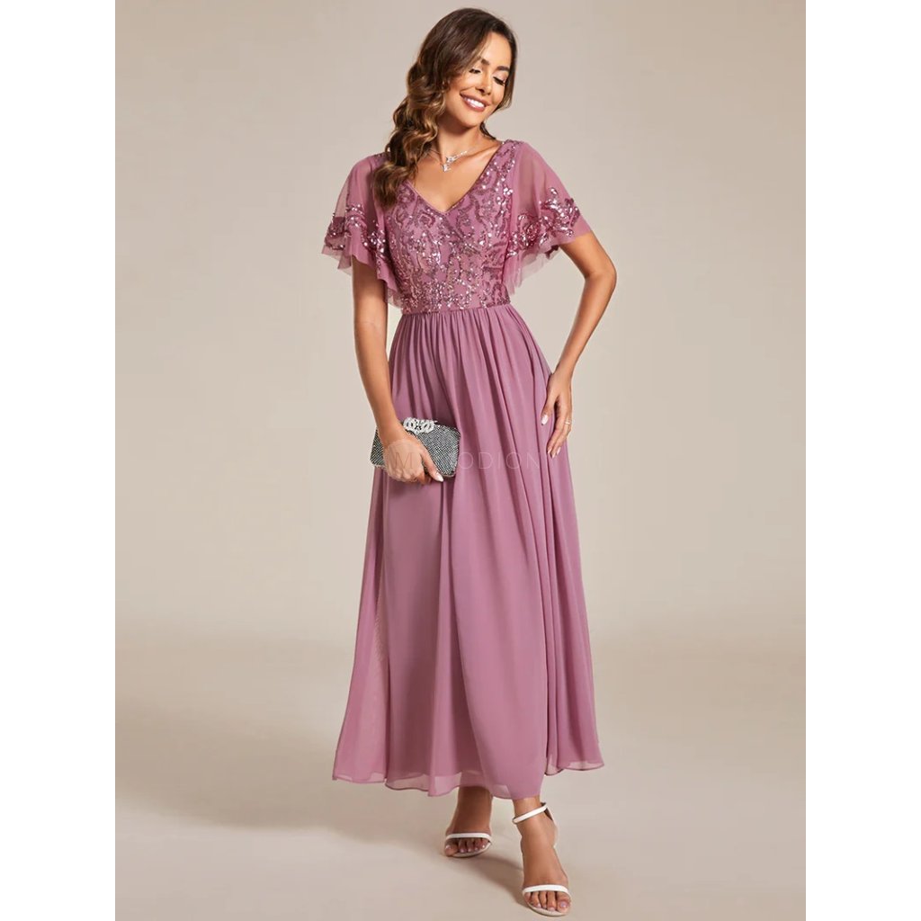 Starorůžové šaty jsou ideální pro svatby i rodinné oslavy. Flitrový živůtek dodává slavnostní nádech, šifonová sukně elegantně splývá a lichotivý střih zakrývá drobné nedostatky.