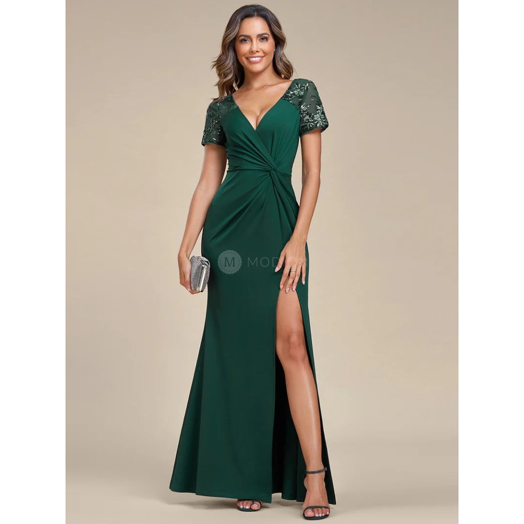 Tmavě zelené smaragdové dlouhé šaty okouzlí svou sytou barvou, která působí luxusně a neobyčejně. Měkký a poddajný materiál je velmi příjemný na nošení a krásně se přizpůsobí postavě. Vysoký rozparek dodává šatům ženskou lehkost a zajišťuje volný pohyb. Originálně řešený průplet v pase zvýrazňuje siluetu a činí model ještě zajímavějším. Krátké rukávy jsou z jemné třpytivé krajky poseté flitry, které při světle působí slavnostně.