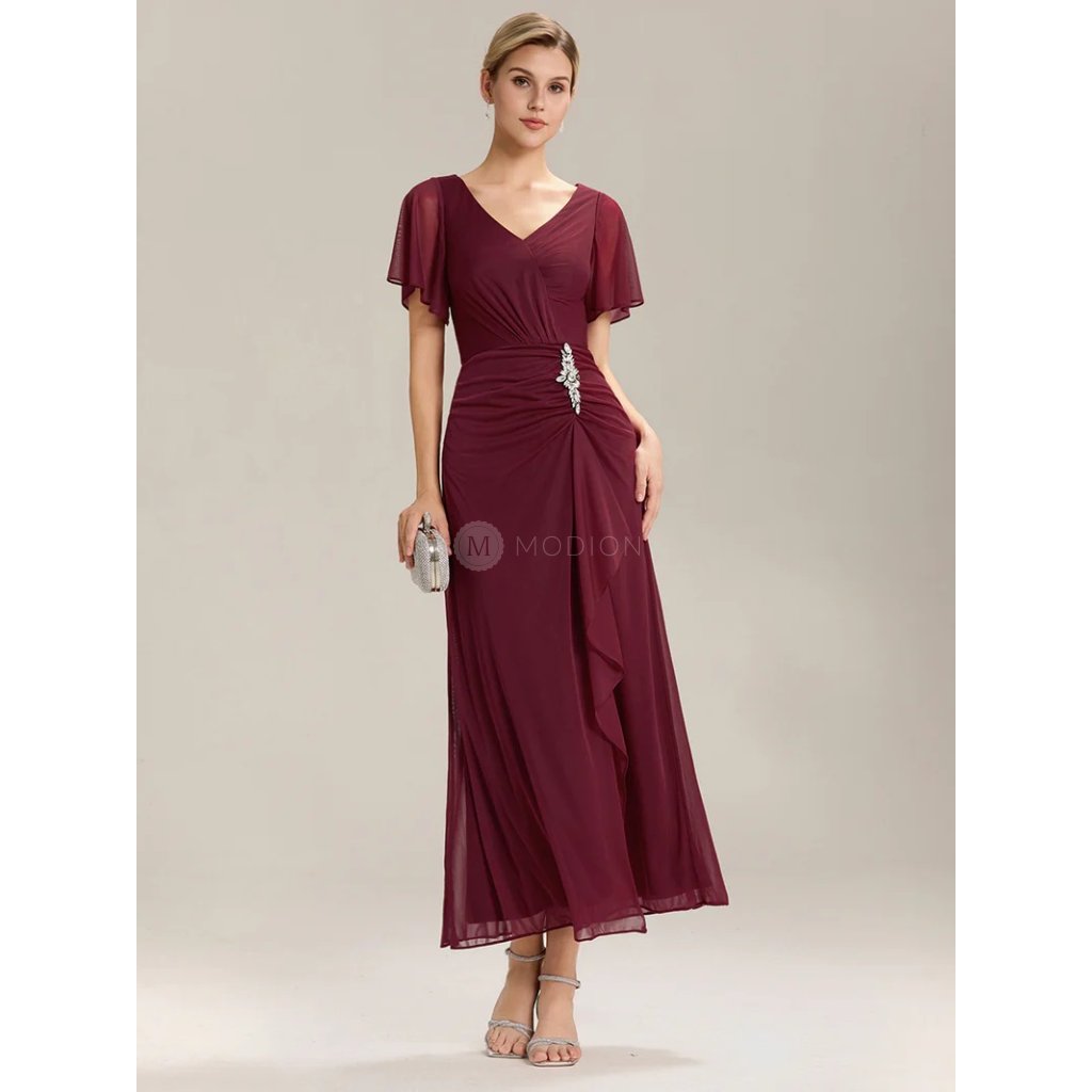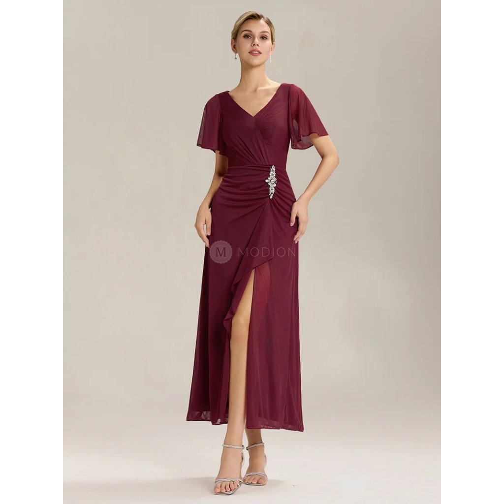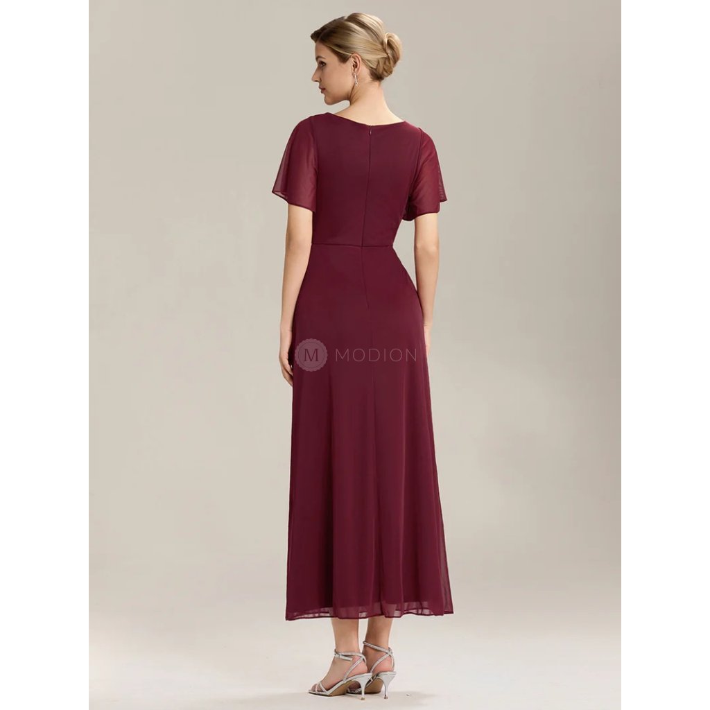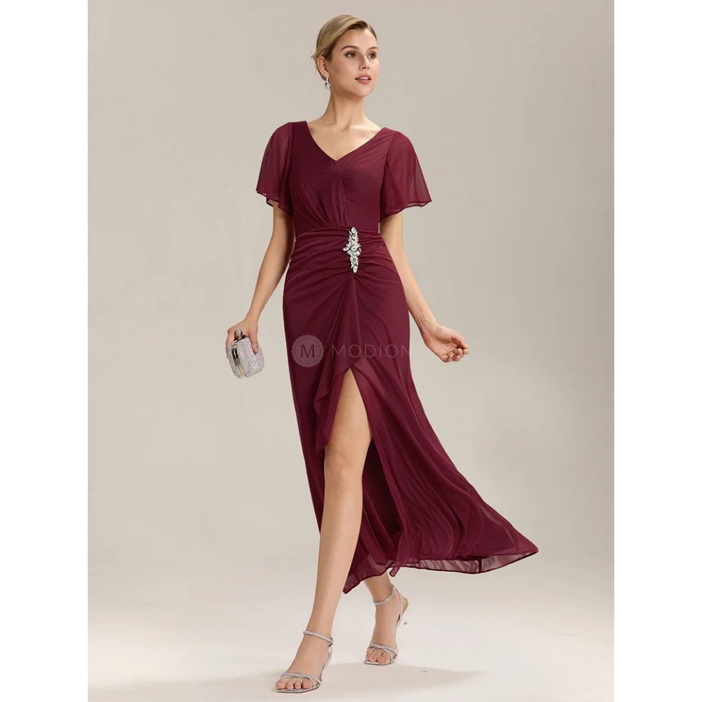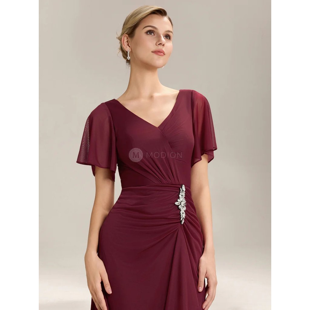 Červené společenské šaty ze šifonu působí elegantně a smyslně. Výstřih do V zvýrazňuje dekolt, krátký rukáv dodává jemnost a pohodlí. Vypasovaný střih obepíná boky a elegantní řasení se štrasovou sponou nad rozparkem opticky zeštíhluje postavu. Dlouhá splývavá sukně se smyslným rozparkem působí odvážně i sofistikovaně. Tyto šaty jsou ideální pro ples, svatbu, maturitní večírek i galavečer.
