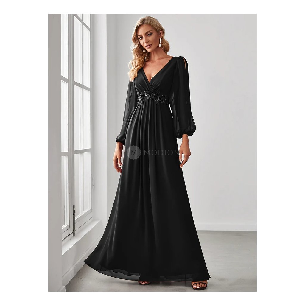 Černé dlouhé společenské šaty z lehkého šifonu představují nadčasovou klasiku v moderním provedení. Áčková sukně se sklady se elegantně vlní při pohybu a lichotí postavě. Pas zdobí jemná krajková aplikace s květinovým vzorem, která dodává šatům slavnostní charakter. Véčkový výstřih decentně zvýrazní dekolt a dlouhé rukávy s rozparkem působí vzdušně i originálně.
