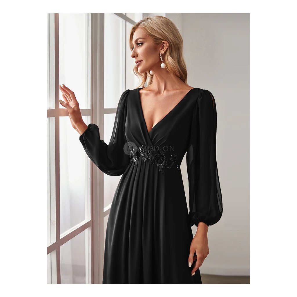 Společenské šaty černé šifonové dlouhý rukáv s rozparkem – model EP00461BK