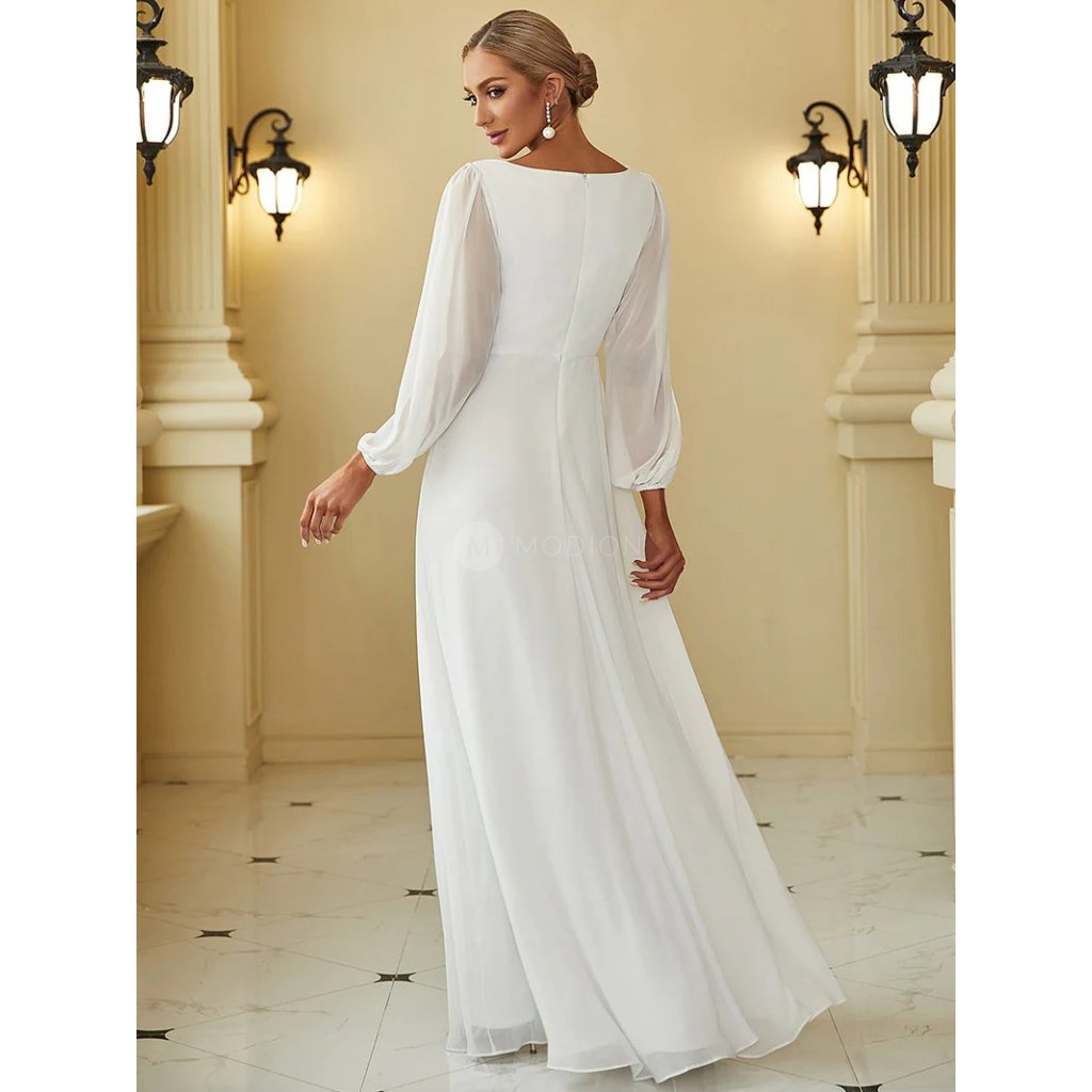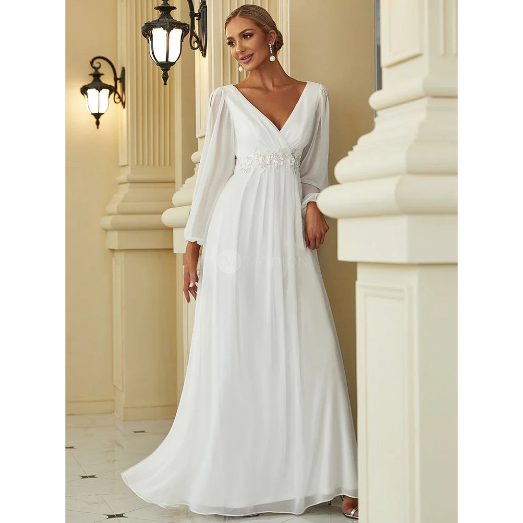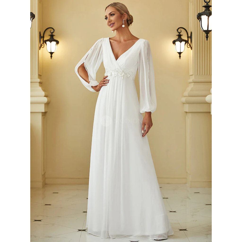 Bílé dlouhé společenské šaty z jemného šifonu působí čistě, vznešeně a velmi elegantně. Áčková sukně se sklady krásně splývá a lichotí postavě, zatímco pas zdobí jemná krajková aplikace s květinovým motivem, která šatům dodává slavnostní charakter. Výstřih do véčka decentně zvýrazní dekolt a dlouhé rukávy s rozparkem přidávají vzdušnost i originální detail.