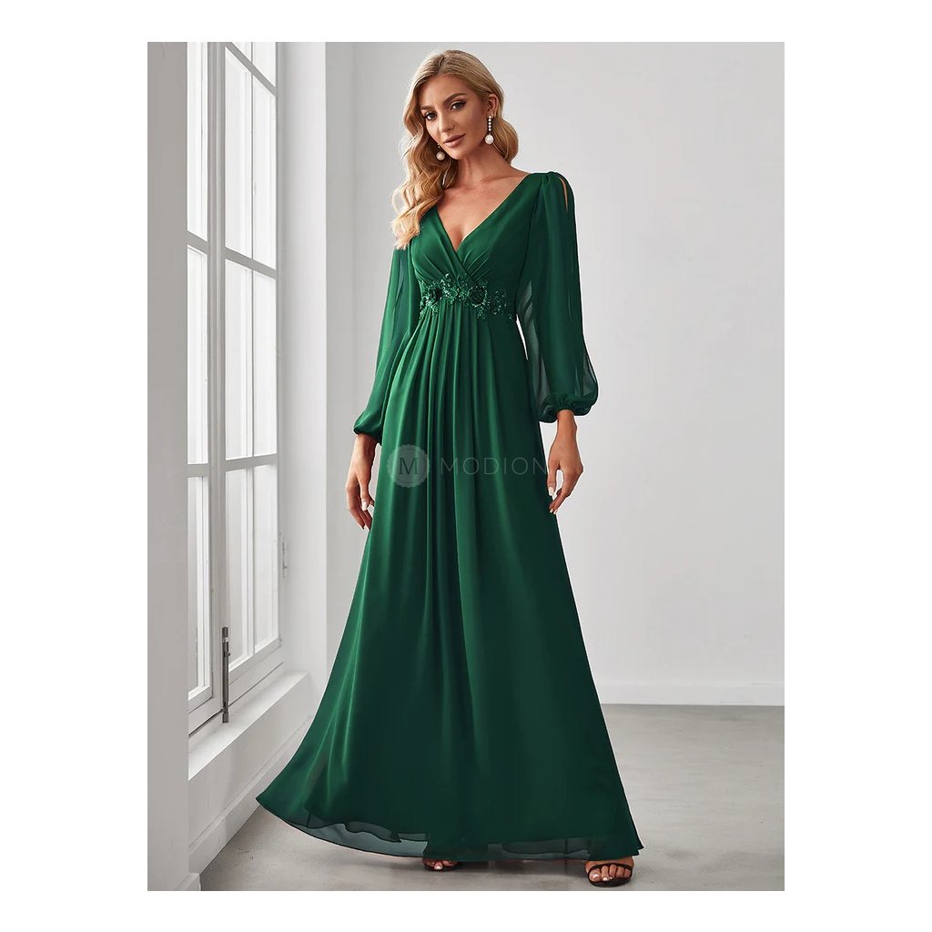 Společenské šaty Hannelore: Dlouhé smaragdově zelené šifonové s krajkou v pase a dlouhým rukávem, na svatbu i ples.