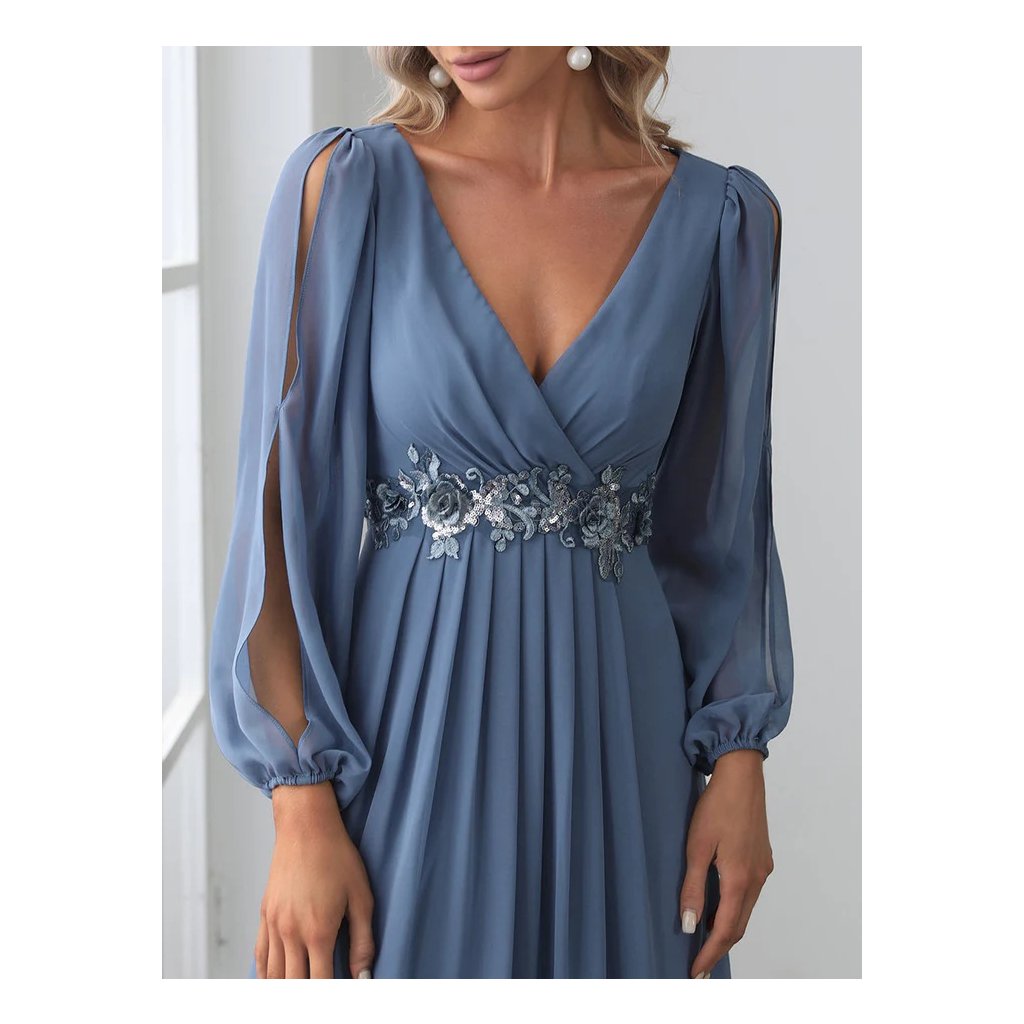 Modrošedé dlouhé společenské šaty působí elegantně a nadčasově. Lehký šifon se při chůzi krásně vlní, áčková sukně se sklady lichotí postavě a vytváří jemně rozšířenou siluetu. Pas zdobí krajková aplikace s květinovým motivem, která dodává šatům slavnostní kouzlo. Výstřih do véčka decentně zvýrazní dekolt a dlouhé rukávy s rozparkem působí vzdušně i originálně.