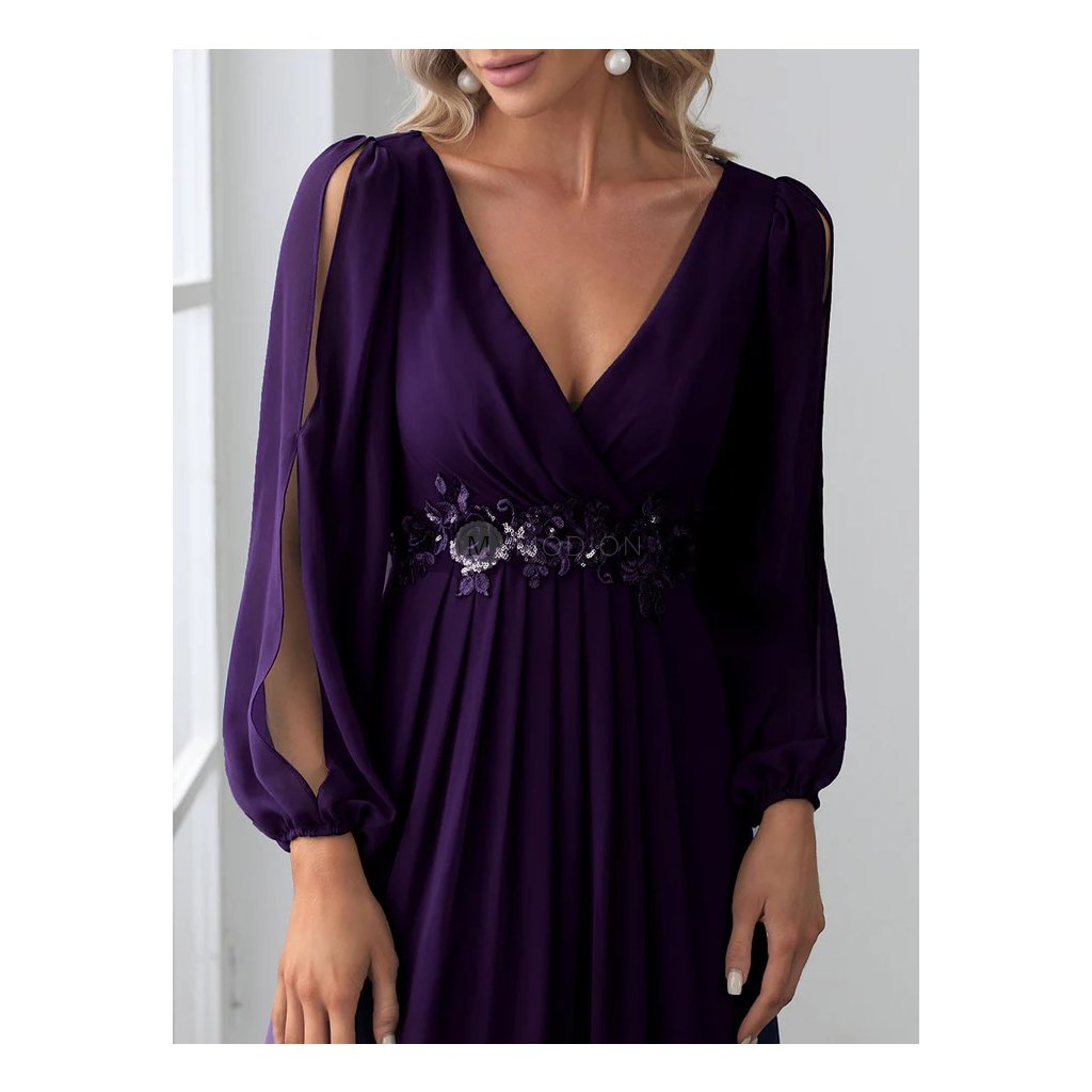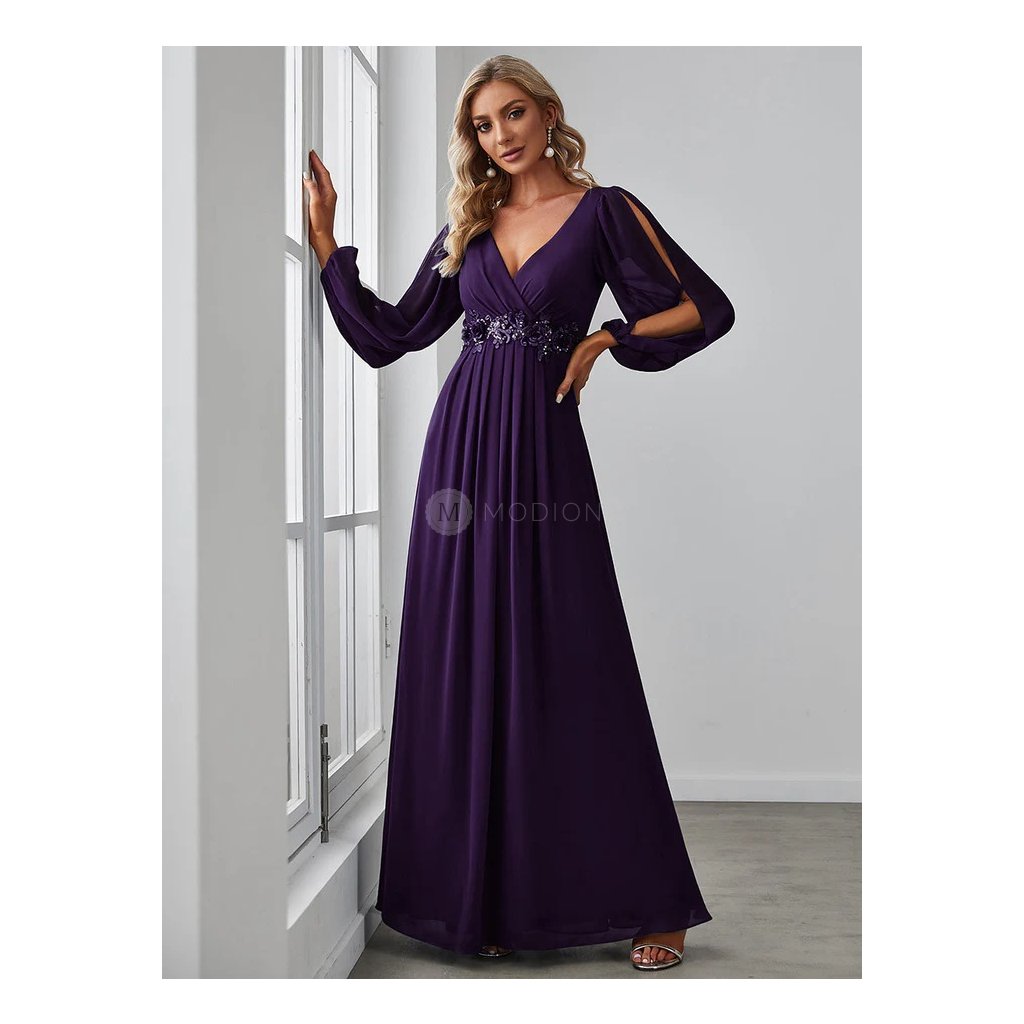 Fialové dlouhé společenské šaty z lehkého šifonu působí elegantně a okouzlujícím dojmem. Áčková sukně se sklady krásně splývá, podtrhuje ženskou siluetu a při pohybu se ladně vlní. Pas zdobí jemná krajková aplikace s květinovým vzorem, která šatům dodává luxusní charakter. Výstřih do véčka decentně zvýrazní dekolt a dlouhé rukávy s rozparkem přidávají vzdušnost i originální detail.