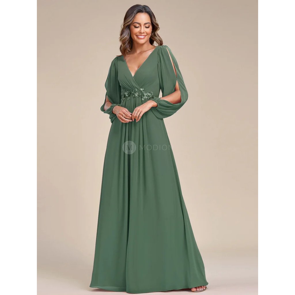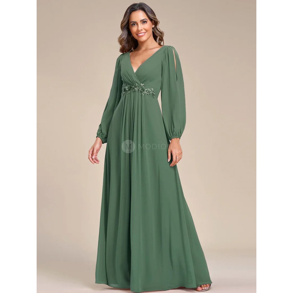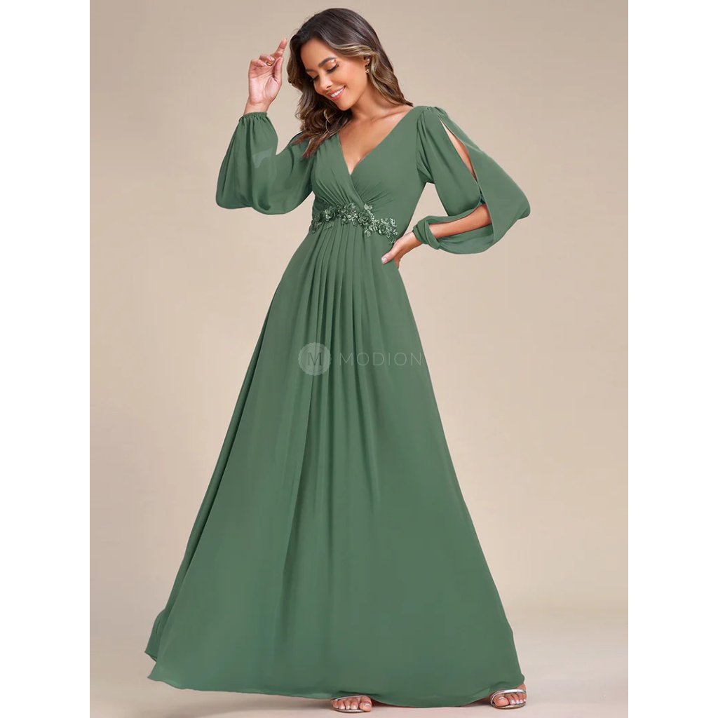 Lehký šifonový materiál dodává šatům vzdušnost a plynulý pohyb při chůzi. Véčkový výstřih krásně lichotí dekoltu, krajková aplikace v pase zvýrazňuje siluetu a dodává modelu jemný dekorativní detail. Dlouhé rukávy s rozparkem působí elegantně a zároveň přinášejí lehký, slavnostní efekt. Celek je vyvážený, ženský a velmi vkusný.