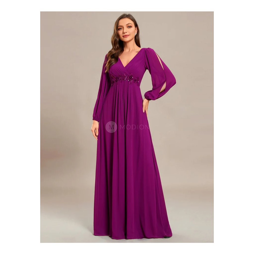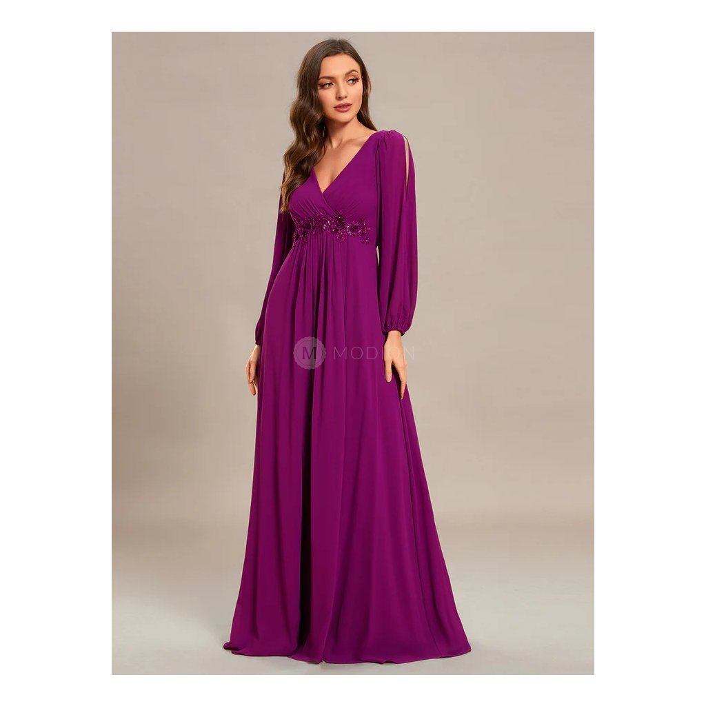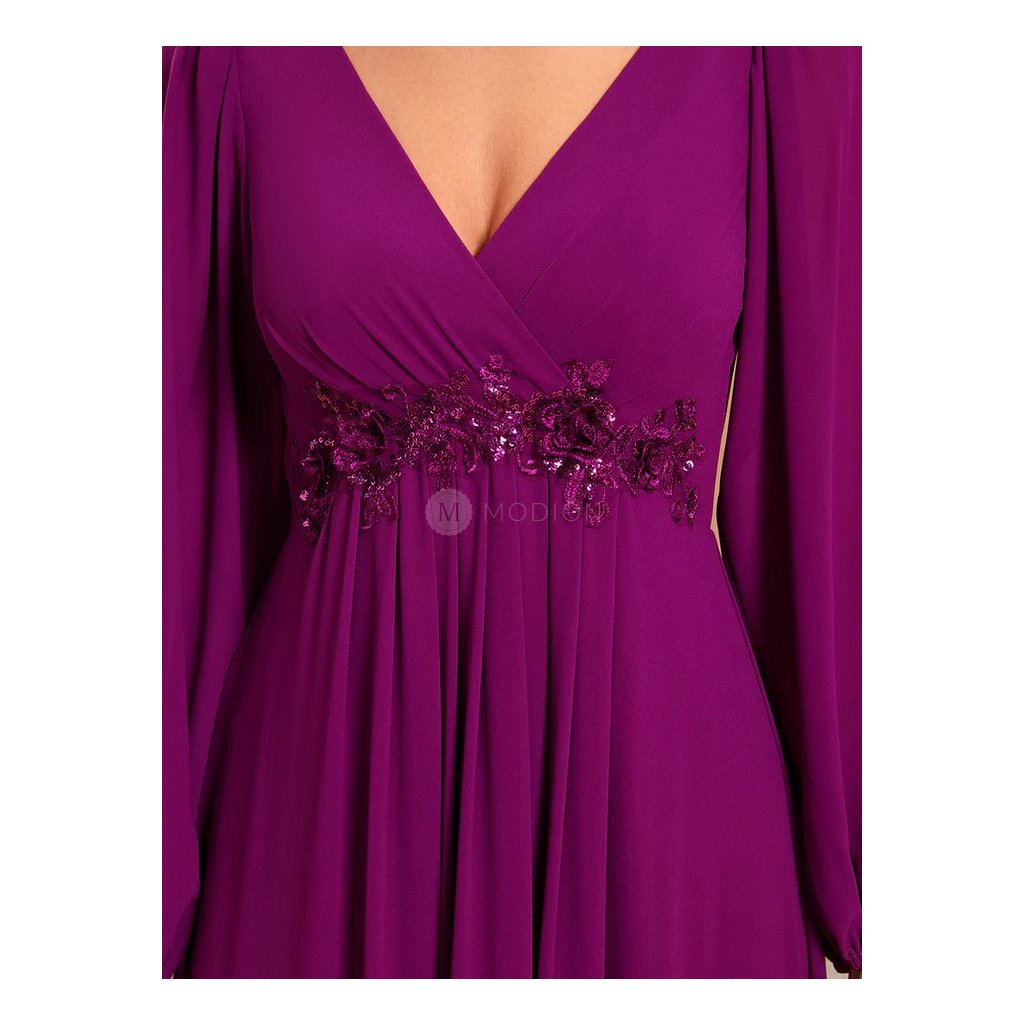Fuchsiové fialové dlouhé společenské šaty z lehkého šifonu okamžitě zaujmou svou výraznou a moderní barvou. Áčková sukně se sklady ladně splývá a při pohybu vytváří elegantní efekt. Pas je ozdoben jemnou krajkovou aplikací s květinovým motivem, která podtrhuje luxusní charakter modelu. Výstřih do véčka působí žensky a dlouhé rukávy s rozparkem dodávají šatům originální vzdušnost.