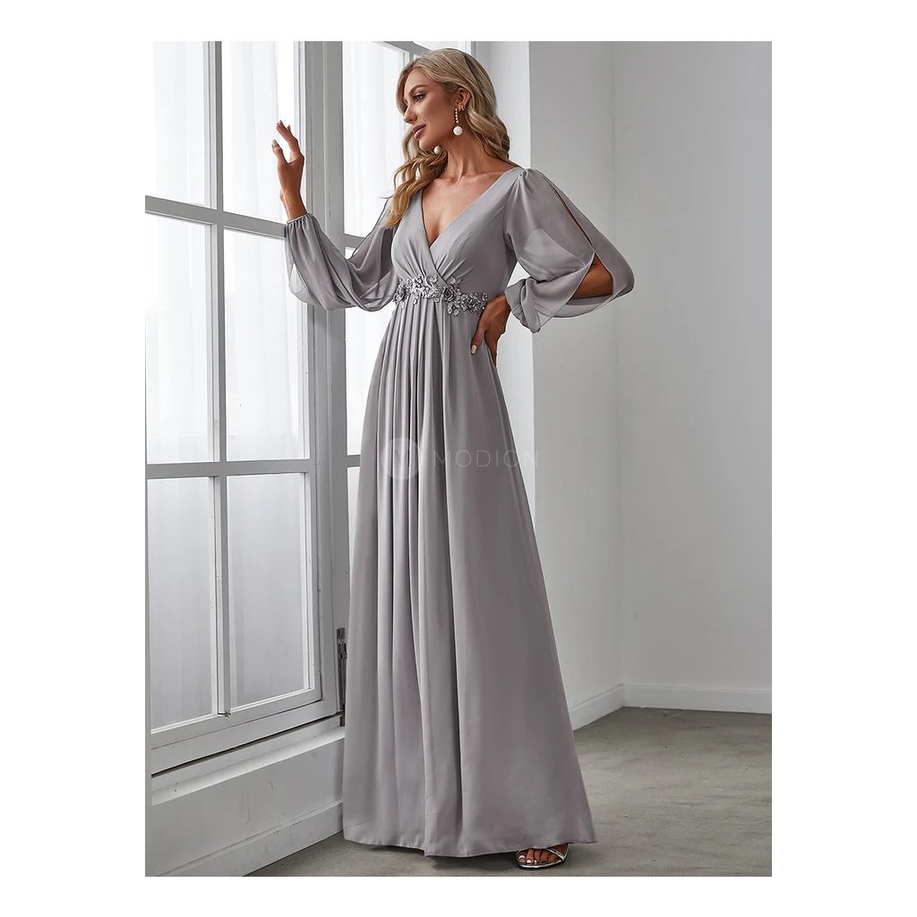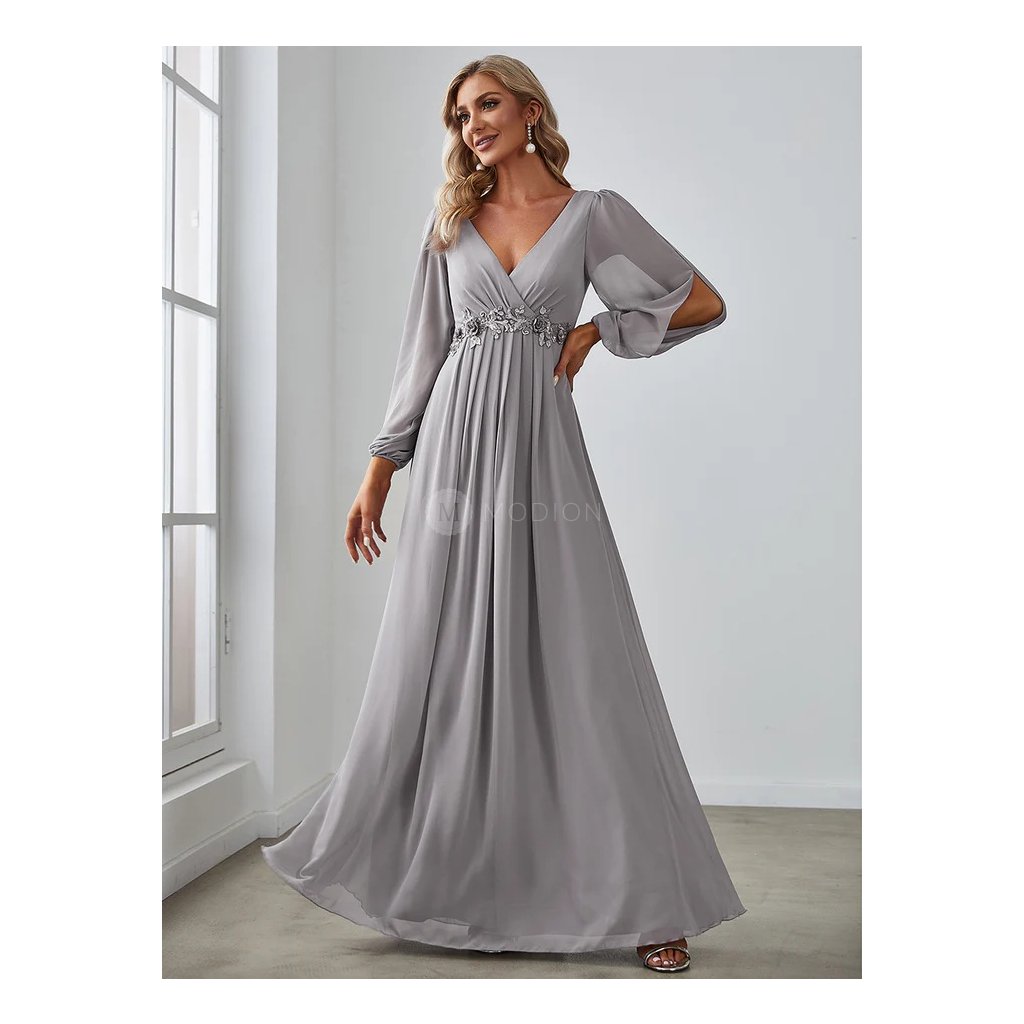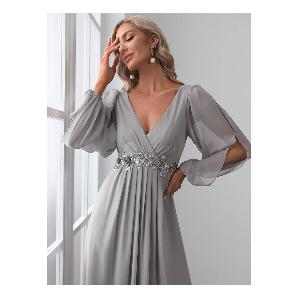 Společenské šaty šedé šifonové dlouhý rukáv s rozparkem – model EP00461GY