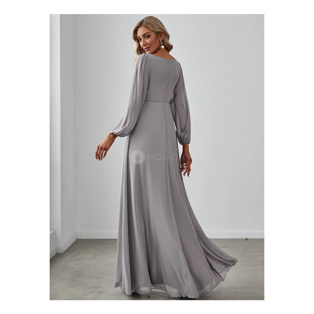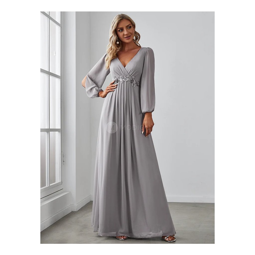 Dlouhé šedé společenské šaty z lehkého šifonu s rukávy a rozparkem působí elegantně, decentně a nadčasově. Jsou ideální volbou pro ženy, které hledají sofistikovaný a ženský model pro slavnostní a formálnější události.