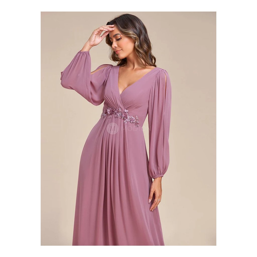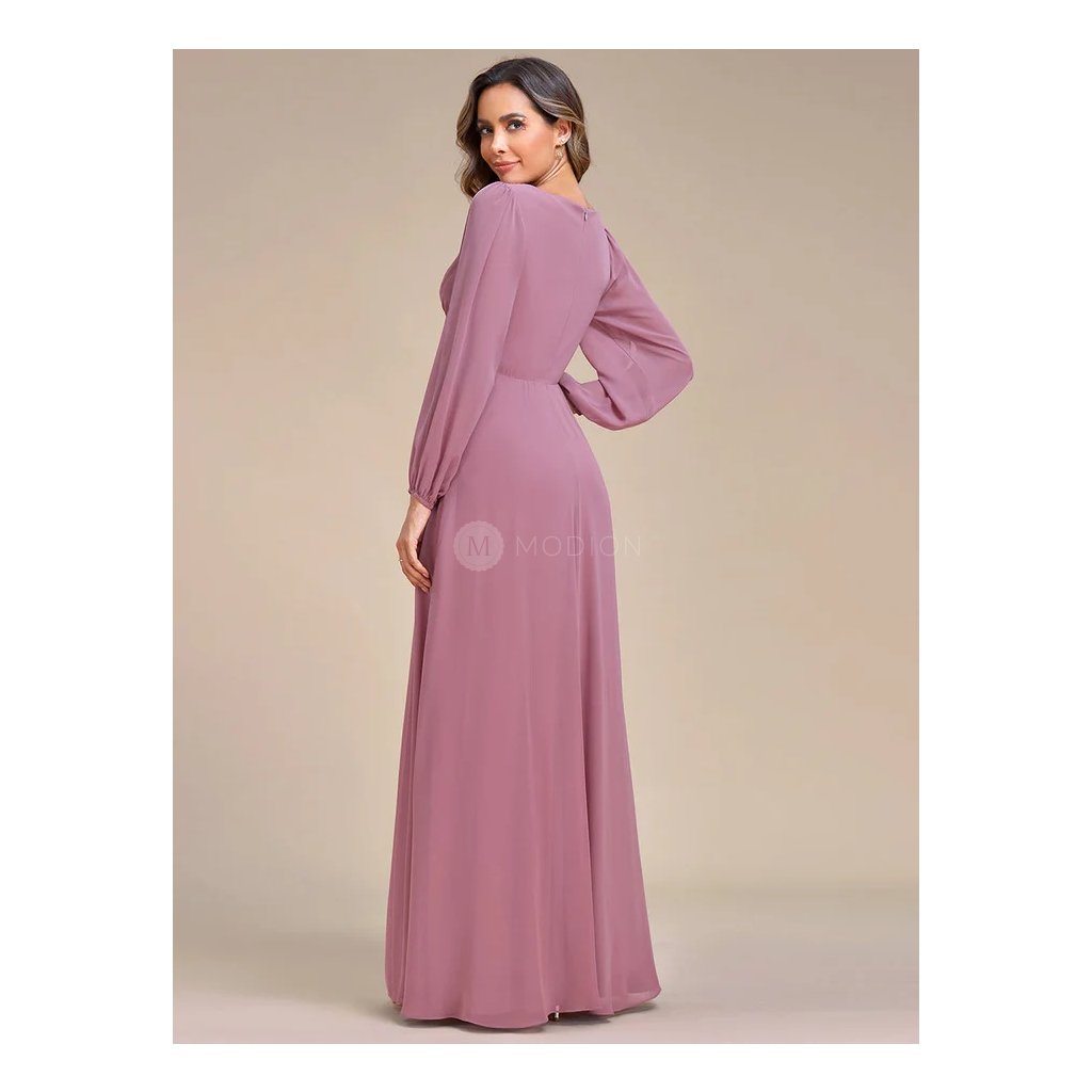 Společenské šaty růžové šifonové dlouhý rukáv s rozparkem – model EP00461OD