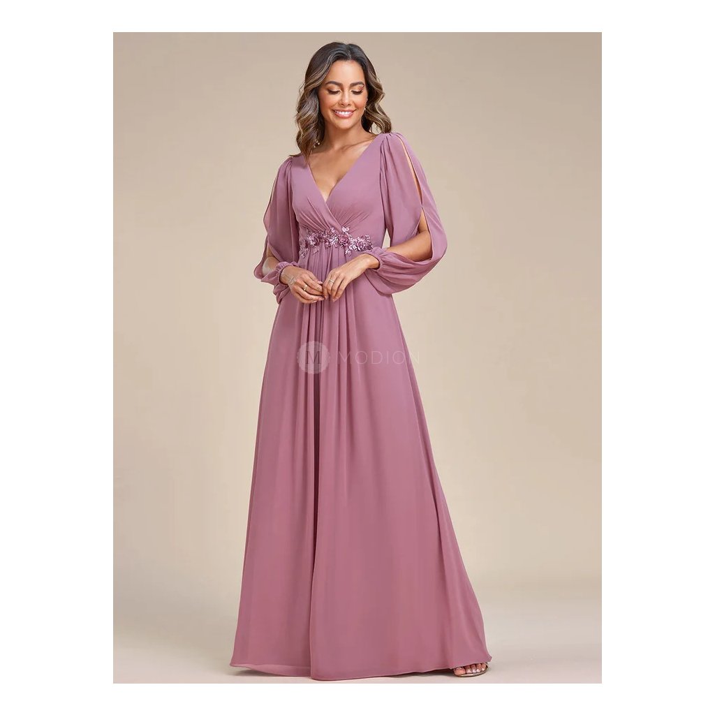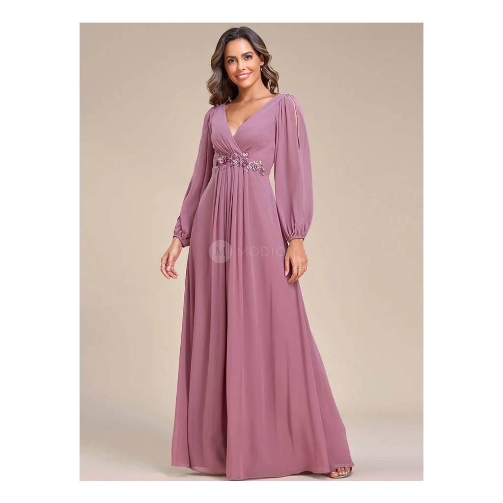 Starorůžové dlouhé společenské šaty z lehkého šifonu působí romanticky a velmi žensky. Áčková sukně se sklady krásně splývá, pas zdobí krajková aplikace s květinovým motivem a výstřih do véčka elegantně zvýrazní dekolt. Dlouhé rukávy s rozparkem dodávají modelu originalitu a lehkost.