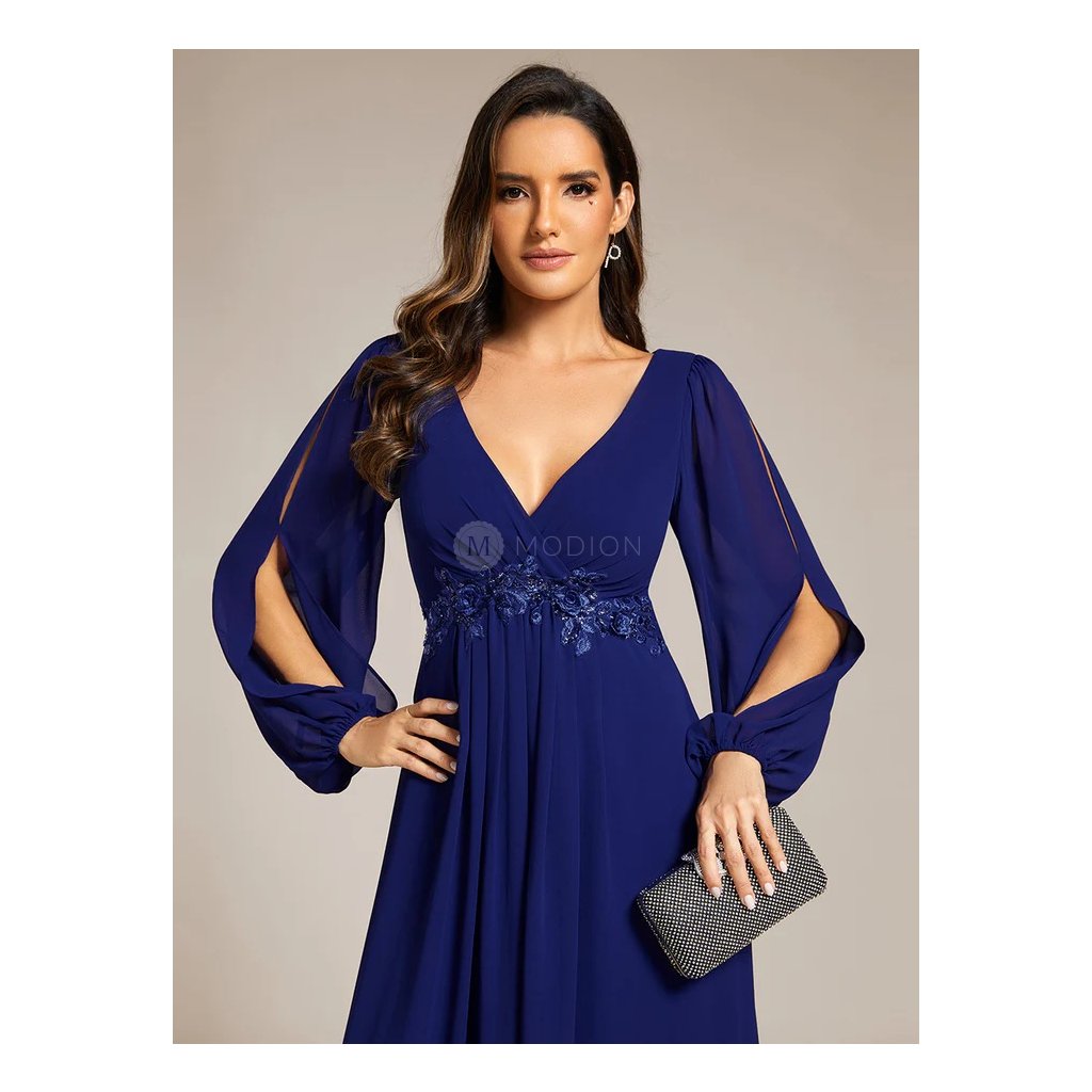 Královsky modré dlouhé společenské šaty z lehkého šifonu působí výrazně, slavnostně a velmi elegantně. Áčková sukně se sklady krásně splývá a při chůzi vytváří ladnou siluetu. Pas zdobí jemná krajková aplikace s květinovým motivem, která podtrhuje luxusní charakter modelu. Véčkový výstřih působí žensky a dlouhé rukávy s rozparkem dodávají šatům vzdušnost i originalitu.