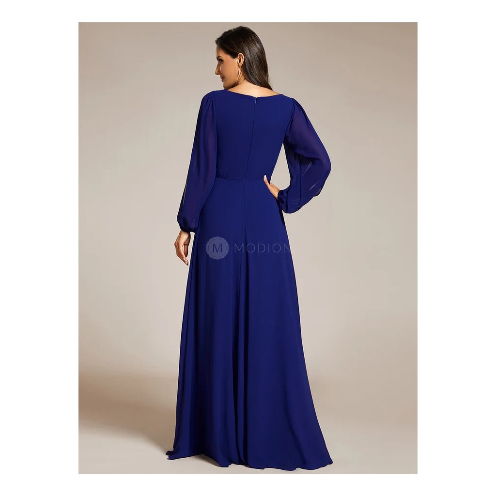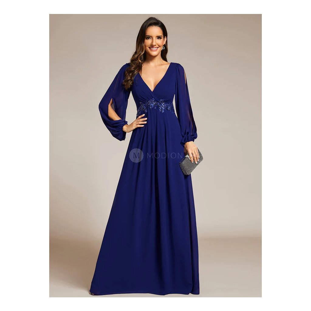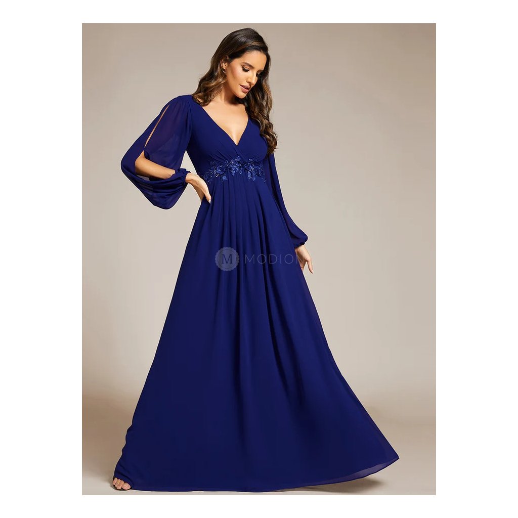 Společenské šaty Hannelore: Dlouhé královsky modré šifonové s krajkou v pase a dlouhým rukávem, na svatbu i ples.