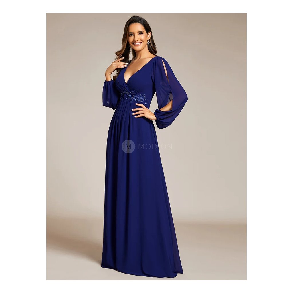 Lehký šifonový materiál dodává šatům vzdušnost a plynulý pohyb, který krásně vyniká při chůzi i tanci. Výstřih do V lichotí dekoltu a opticky prodlužuje postavu. Krajková aplikace v pase vytváří elegantní středobod modelu a zvýrazňuje ženské linie. Dlouhé rukávy s rozparkem působí velmi efektně, dodávají šatům lehkost a podtrhují slavnostní charakter. Dlouhá sukně splývá ladně a vytváří vyvážený, velmi reprezentativní celek.