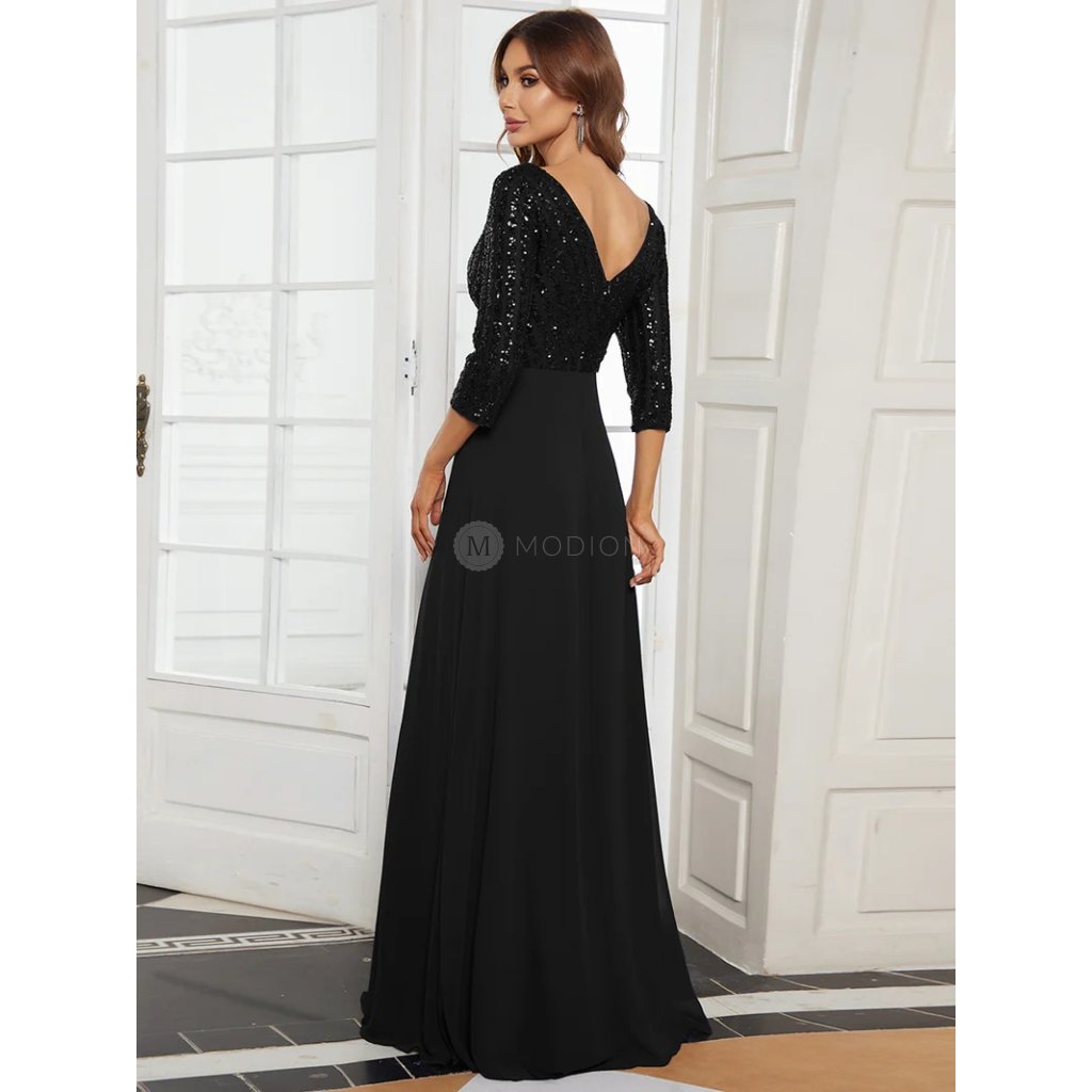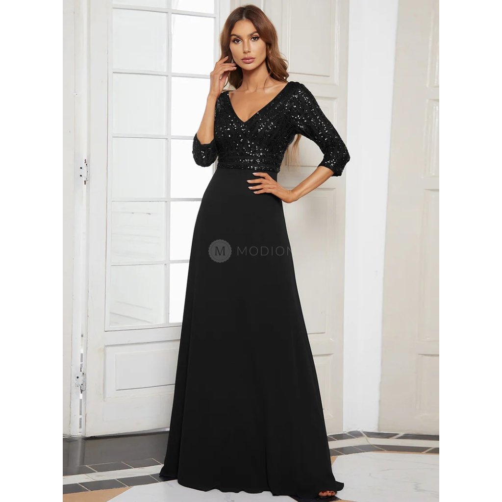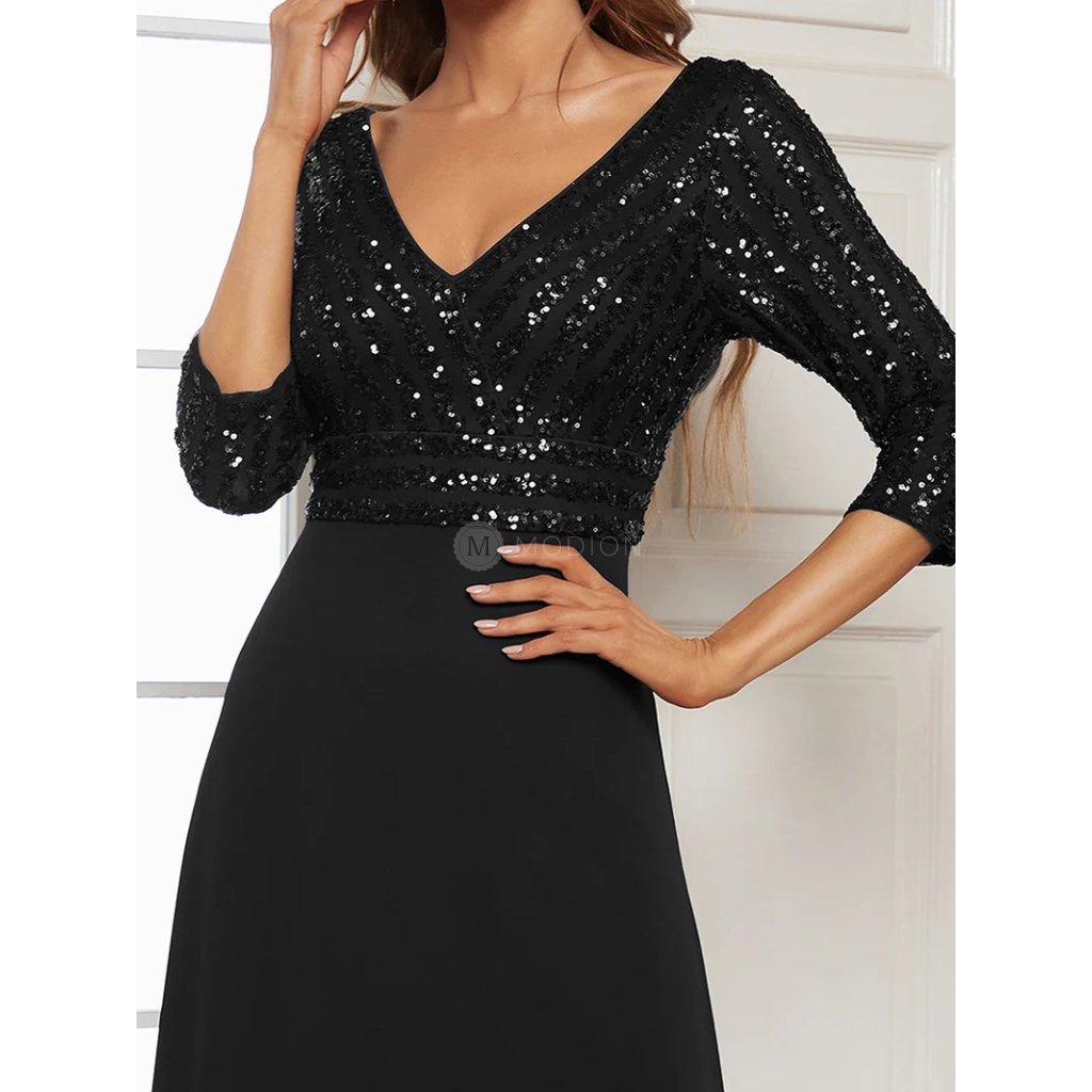 Černé elegantní společenské šaty představují nadčasovou klasiku v moderním zpracování. Živůtek z poddajného a příjemného materiálu je bohatě posetý flitry, které se nádherně třpytí. Výstřih do V lichotí postavě a rukávy po lokty přidávají vyvážený vzhled. Splývavá šifonová sukně v áčkovém střihu se lehce vlní při chůzi.