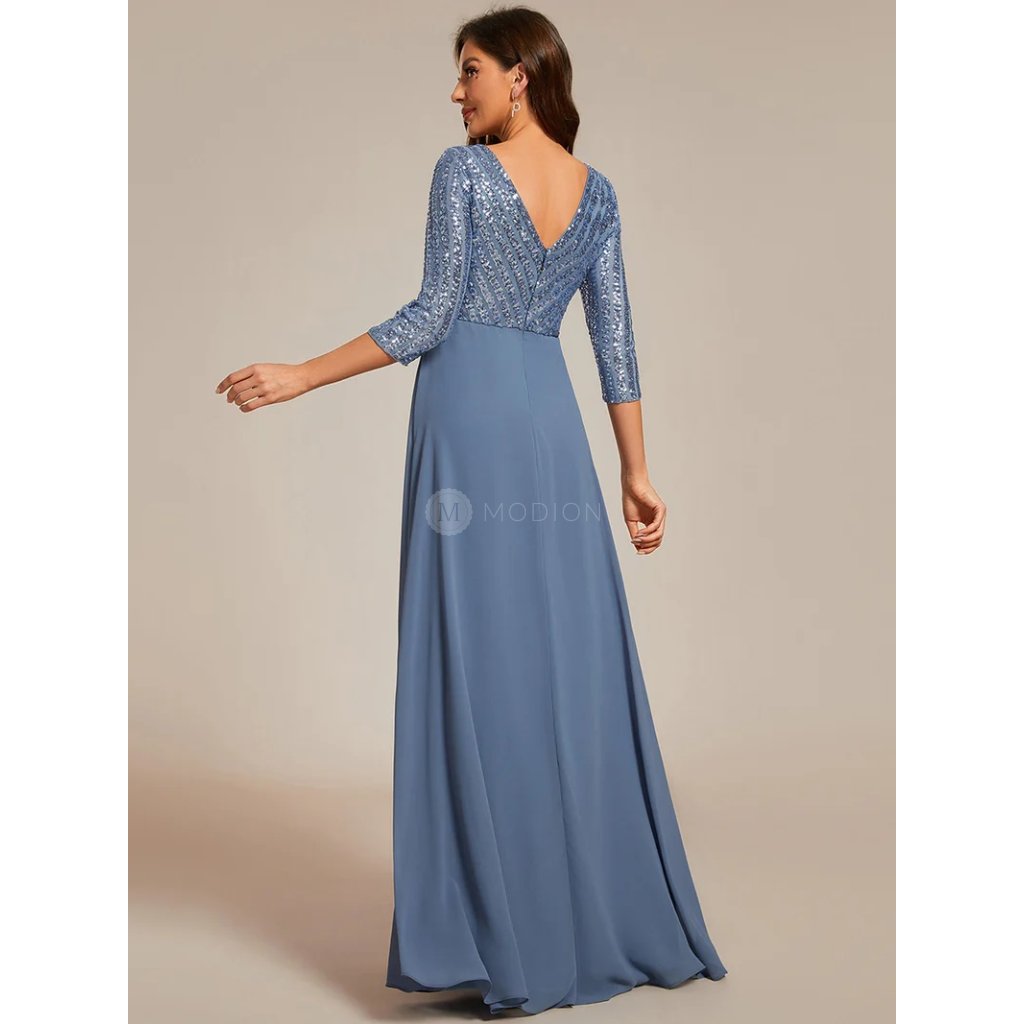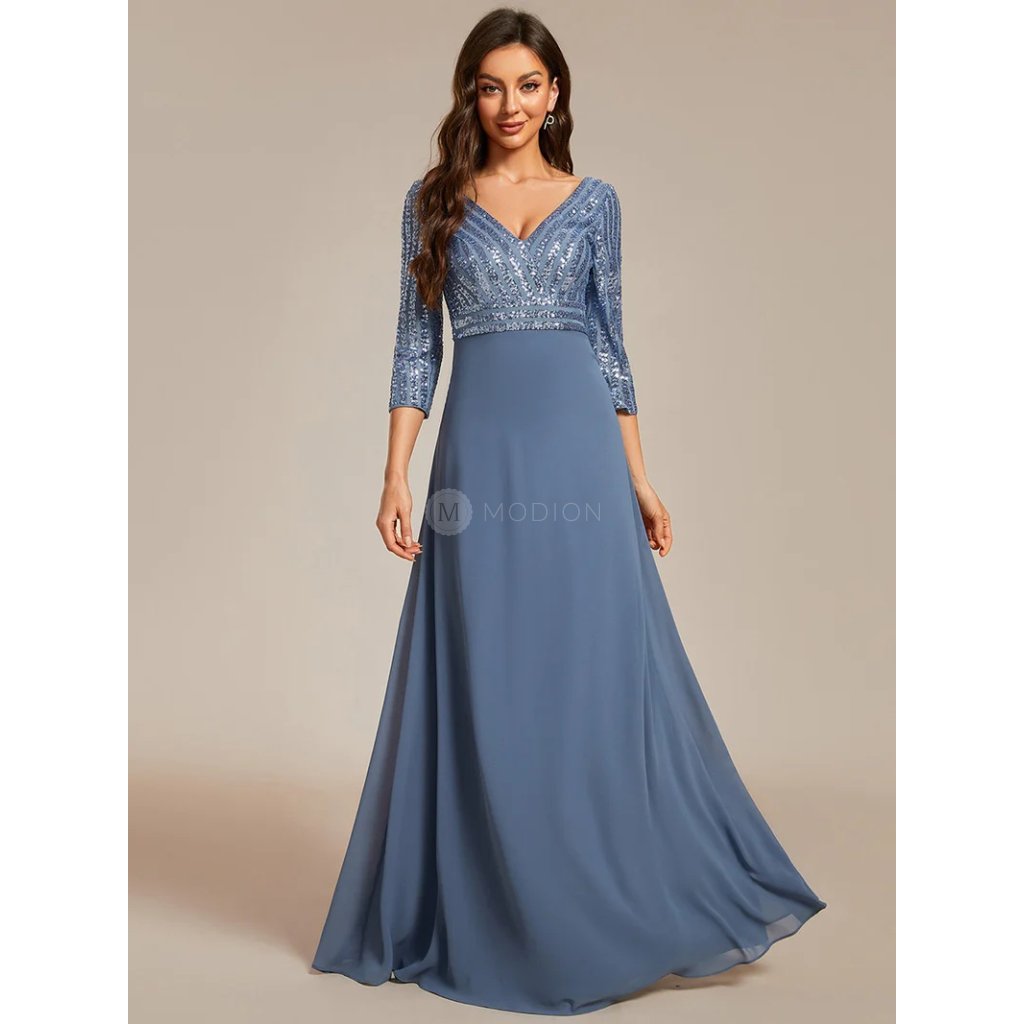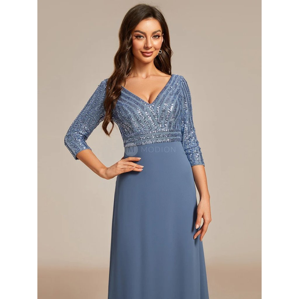 Společenské šaty modré třpytivé šifonové s polodlouhým rukávem – model EP00751DN