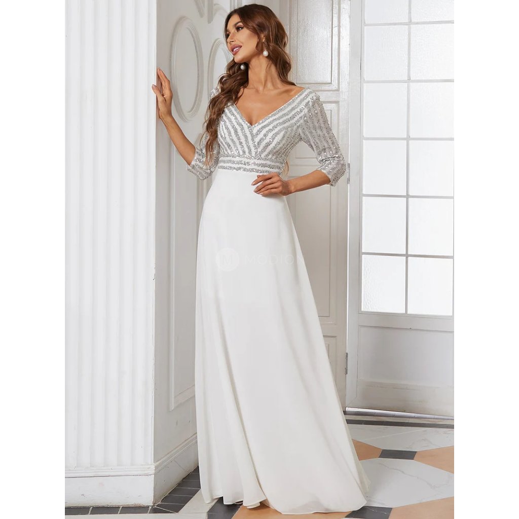 Lehká splývavá šifonová sukně zajišťuje vzdušnost a elegantní pohyb při chůzi i tanci. Horní část je zdobena stříbrnými flitry, které vytvářejí jemný třpytivý efekt a dodávají modelu luxusní slavnostní nádech. Živůtek s rukávy je z poddajného, mírně elastického materiálu, který se pohodlně přizpůsobí postavě a přirozeně zvýrazní siluetu. Výstřih do V lichotí dekoltu a podtrhuje něžný, ženský vzhled celého modelu. Celek působí harmonicky, romanticky a velmi vkusně.