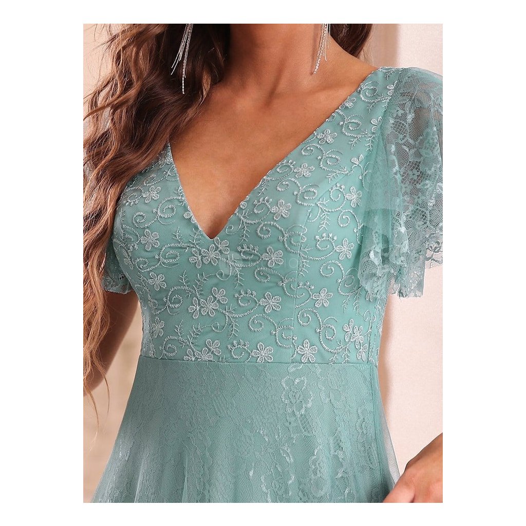 V modrozelených krajkových šatech zazáříte romantickou elegancí, výstřih do V zvýrazní ženskost a tylová sukně dodá lehkost i slavnostní půvab.