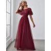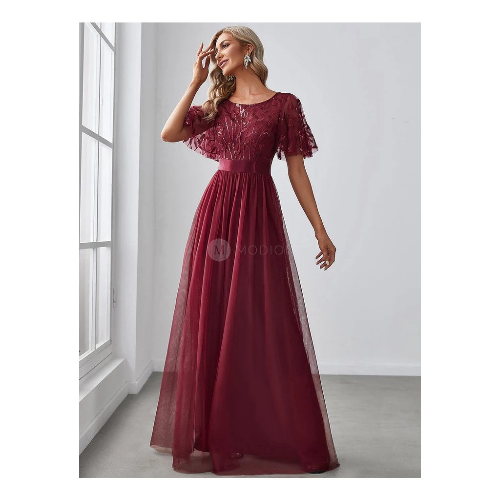 Půvabné společenské šaty ve výrazném vínovém odstínu okouzlí na první pohled třpytivým živůtkem s kulatým výstřihem a krátkými rukávy. Lehká vícevrstvá tylová sukně dodává modelu vzdušnost a romantický nádech – při pohybu se krásně vlní a působí velmi elegantně. Šaty jsou navrženy tak, aby lichotily ženské postavě, a zároveň poskytují maximální pohodlí při tanci i celovečerním nošení. Jemný třpyt podtrhuje slavnostní charakter modelu, aniž by působil rušivě. Skvělá volba na ples, maturitní večer, galavečer nebo jako šaty pro svatební hostku. V těchto šatech se budete cítit jako víla z pohádky – jemná, okouzlující a nezapomenutelná.