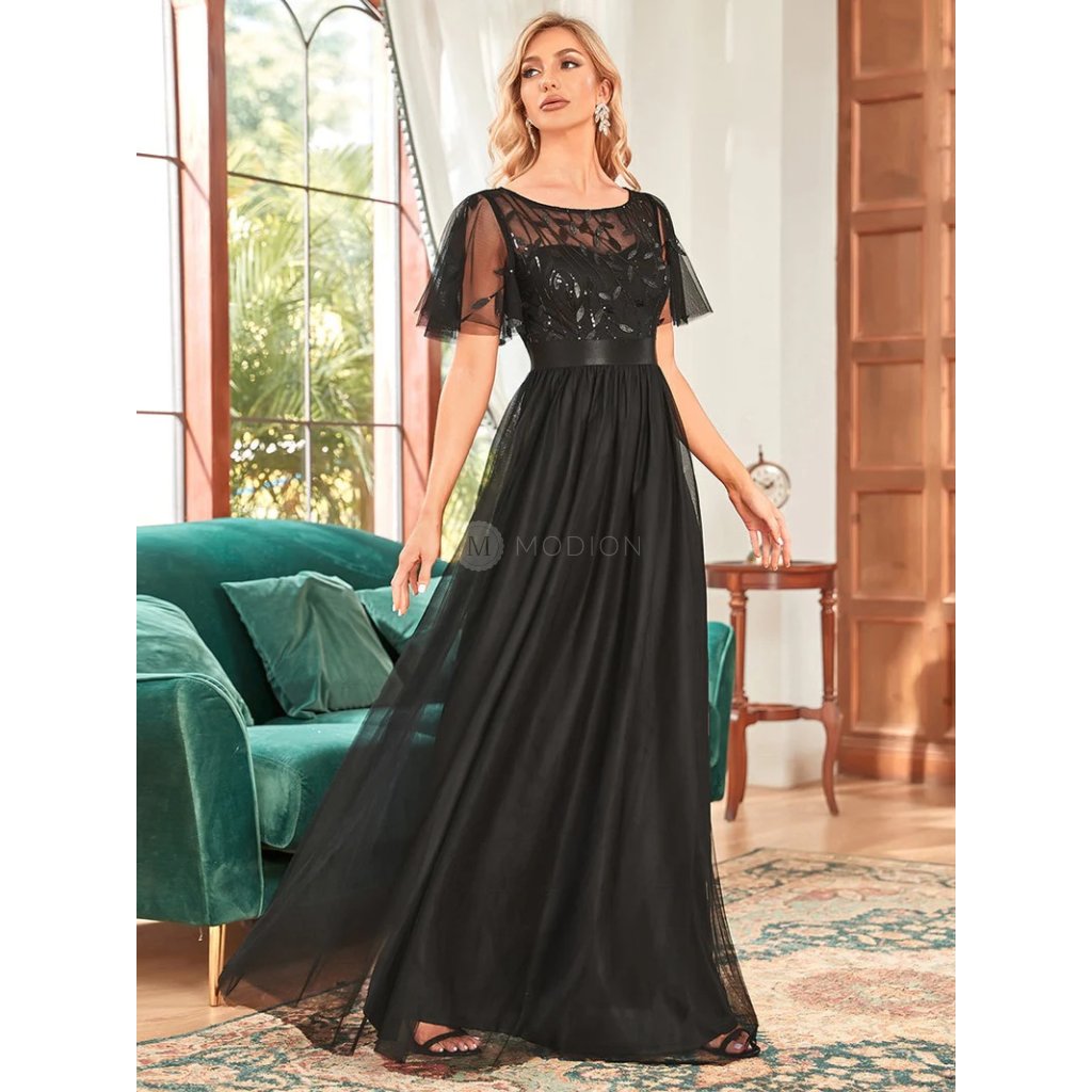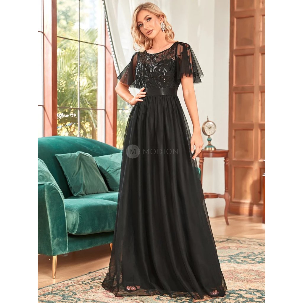 Půvabné společenské šaty v elegantním černém provedení okouzlí na první pohled třpytivým živůtkem s kulatým výstřihem a krátkými rukávy. Kombinace jemných flitrů a hladké siluety působí luxusně, přitom stále vkusně. Lehká vícevrstvá tylová sukně dodává šatům vzdušnost a krásně se vlní při chůzi, což vytváří velmi sofistikovaný a slavnostní efekt.
