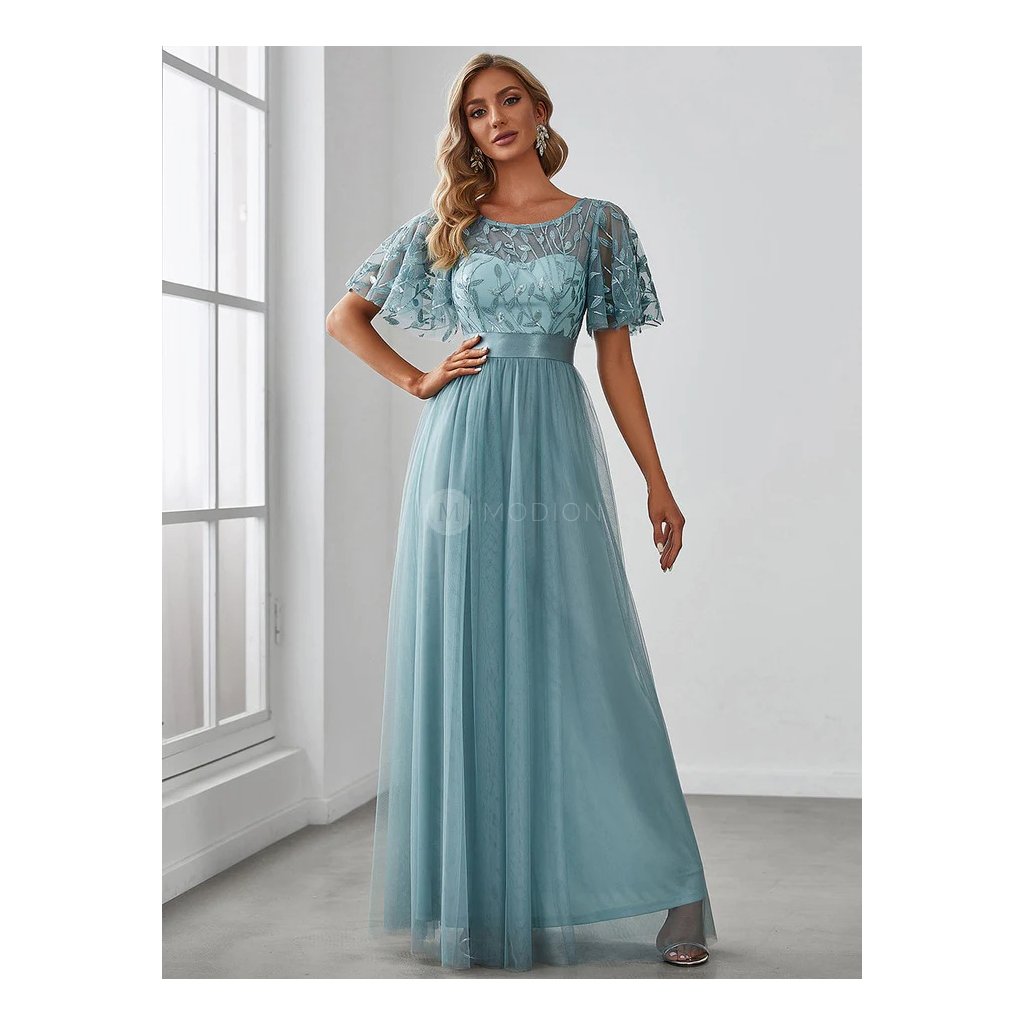 Půvabné společenské šaty ve světle modré barvě okouzlí na první pohled třpytivým živůtkem s kulatým výstřihem a krátkými rukávy. Lehká vícevrstvá tylová sukně dodává modelu vzdušnost a romantický nádech – při pohybu se krásně vlní a působí velmi elegantně. Šaty jsou navrženy tak, aby lichotily ženské postavě, a zároveň poskytují maximální pohodlí při tanci i celovečerním nošení. Jemný třpyt podtrhuje slavnostní charakter modelu, aniž by působil rušivě. Skvělá volba na ples, maturitní večer, galavečer nebo jako elegantní šaty pro svatební hostku. V těchto šatech se budete cítit jako víla z pohádky – jemná, okouzlující a nezapomenutelná.