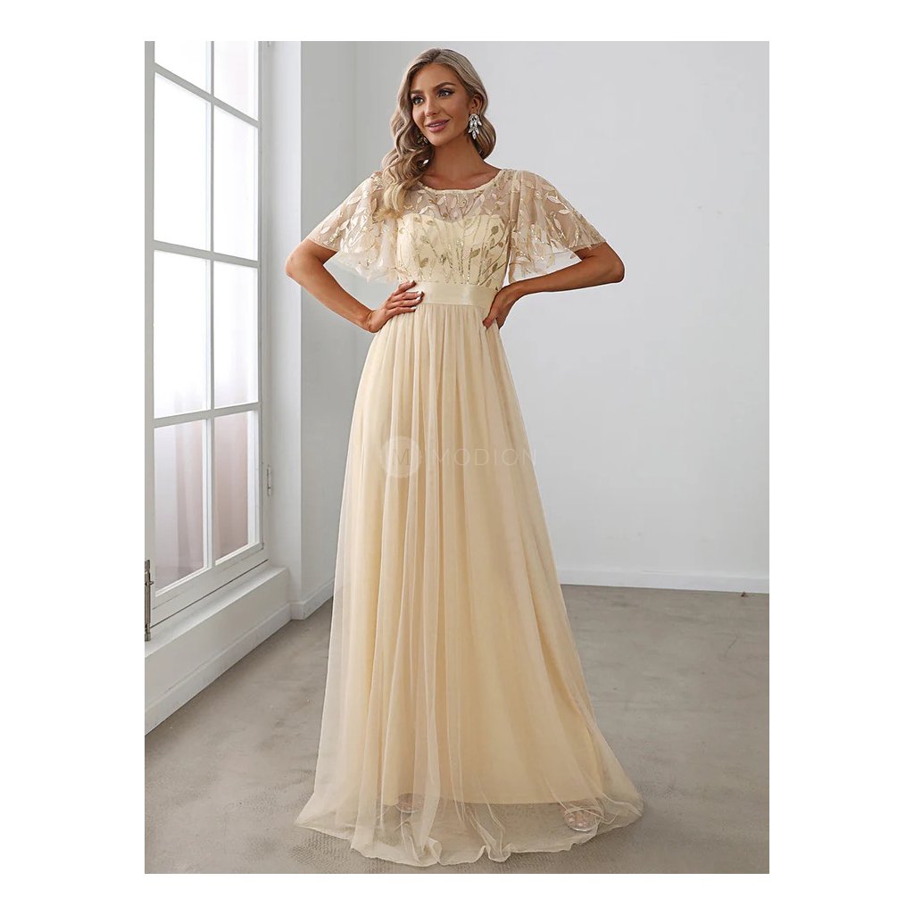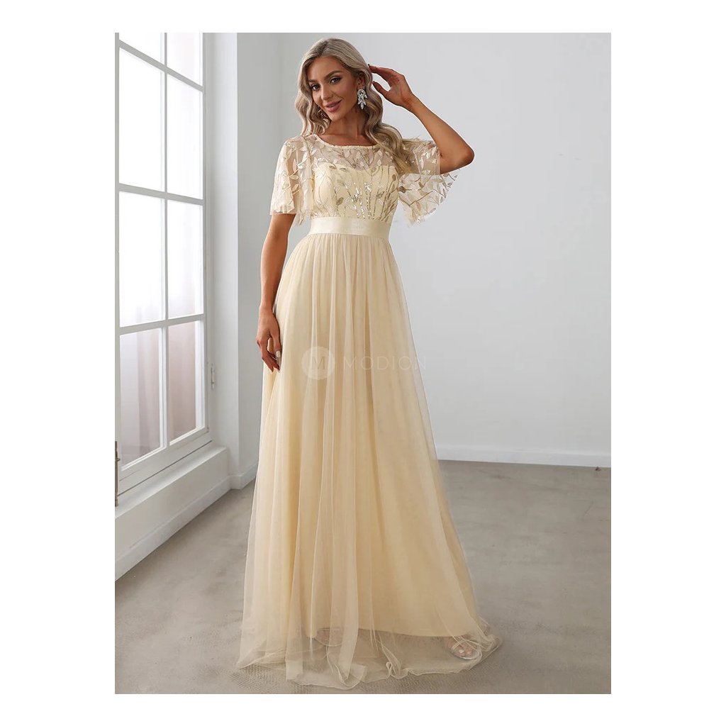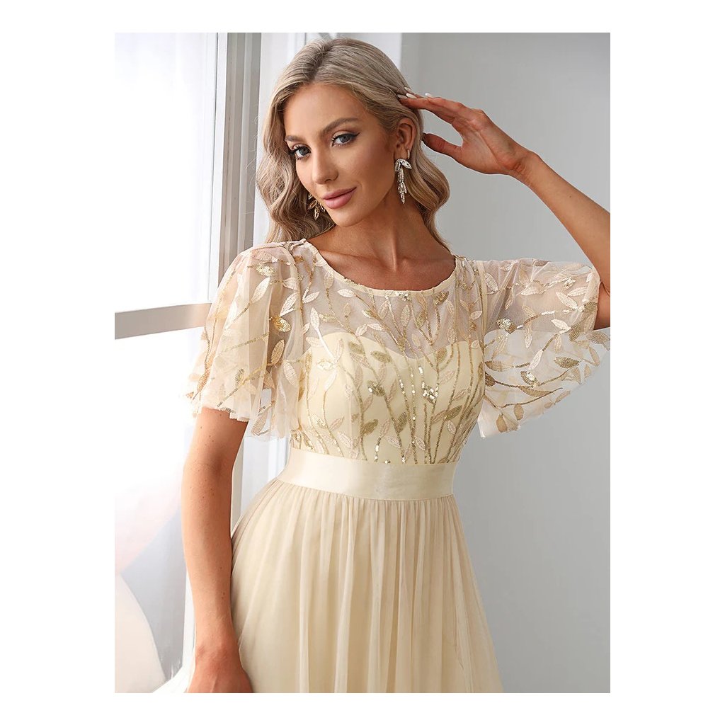 Půvabné společenské šaty v krémově zlaté barvě okouzlí na první pohled třpytivým živůtkem s kulatým výstřihem a krátkými rukávy. Lehká vícevrstvá tylová sukně dodává modelu vzdušnost a romantický nádech – při pohybu se krásně vlní a působí velmi elegantně. Šaty jsou navrženy tak, aby lichotily ženské postavě, a zároveň poskytují maximální pohodlí při tanci i celovečerním nošení. Jemný třpyt podtrhuje slavnostní charakter modelu, aniž by působil rušivě. Skvělá volba na ples, maturitní večer, galavečer nebo jako elegantní šaty pro svatební hostku. V těchto šatech se budete cítit jako víla z pohádky – jemná, okouzlující a nezapomenutelná.