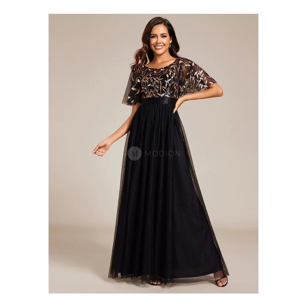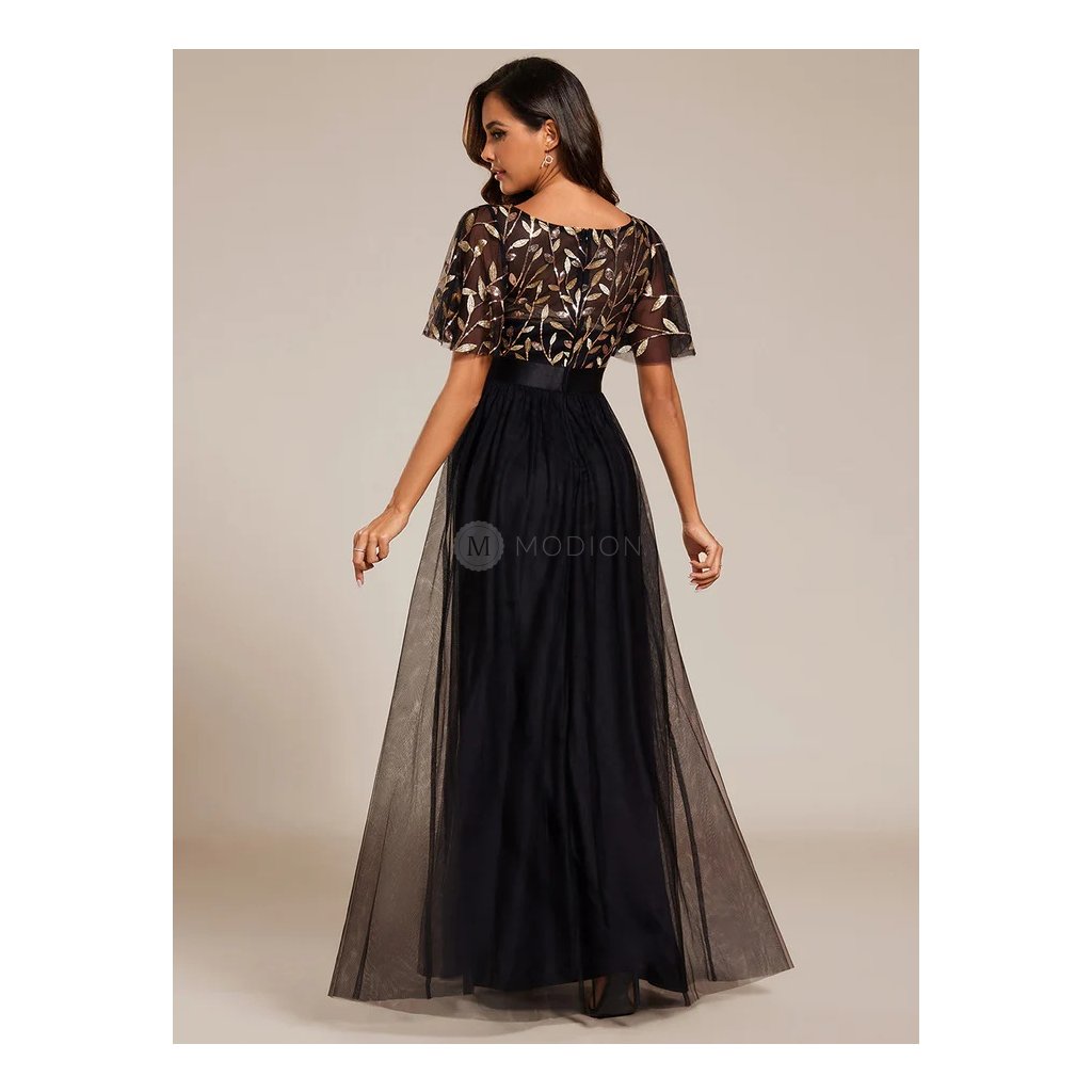 Půvabné společenské šaty v luxusním černo zlatém provedení okouzlí na první pohled třpytivým živůtkem s kulatým výstřihem a krátkými rukávy. Lehká vícevrstvá tylová sukně dodává modelu vzdušnost a elegantní nádech, který se při pohybu krásně vlní a působí velmi sofistikovaně. Šaty jsou navrženy tak, aby lichotily ženské postavě, a zároveň poskytují maximální pohodlí při tanci i celovečerním nošení. Jemný třpyt zdůrazňuje slavnostní charakter modelu, aniž by působil rušivě. Ideální volba na ples, galavečer, slavnostní událost nebo jako šaty pro svatební hostku. V těchto šatech budete působit elegantně, sebevědomě a nezapomenutelně.