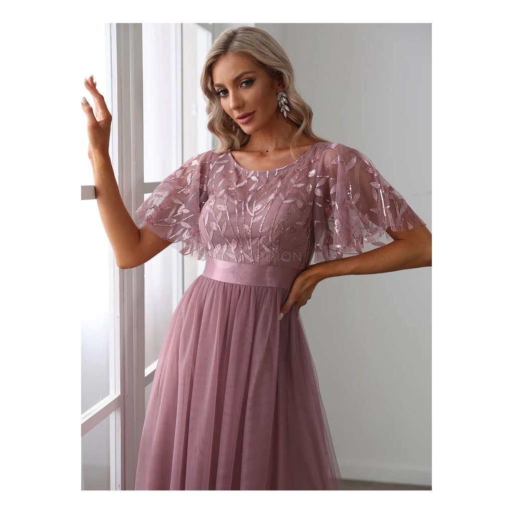 Půvabné společenské šaty v jemném odstínu starorůžové barvy okouzlí na první pohled třpytivým živůtkem s kulatým výstřihem a krátkými rukávy. Lehká vícevrstvá tylová sukně dodává modelu vzdušnost a romantický nádech – při pohybu se krásně vlní a působí velmi elegantně. Šaty jsou navrženy tak, aby lichotily ženské postavě, a zároveň poskytují maximální pohodlí při tanci i celovečerním nošení. Jemný třpyt podtrhuje slavnostní charakter modelu, aniž by působil rušivě. Skvělá volba na ples, maturitní večer, galavečer nebo jako šaty pro svatební hostku. V těchto šatech se budete cítit jako víla z pohádky – jemná, okouzlující a nezapomenutelná.