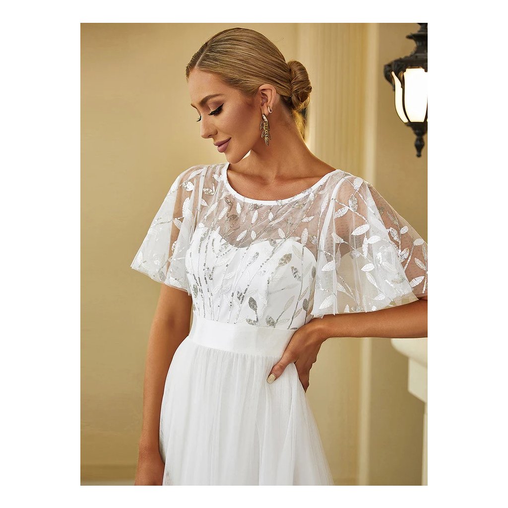Půvabné společenské šaty v elegantní bílé barvě okouzlí na první pohled třpytivým živůtkem s kulatým výstřihem a krátkými rukávy. Lehká vícevrstvá tylová sukně dodává modelu vzdušnost a romantický nádech – při pohybu se krásně vlní a působí velmi jemně a slavnostně. Šaty jsou navrženy tak, aby lichotily ženské postavě, a zároveň poskytují maximální pohodlí při tanci i celovečerním nošení. Jemný třpyt podtrhuje slavnostní charakter modelu, aniž by působil rušivě.