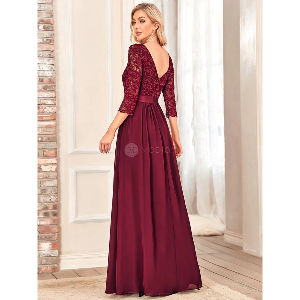 Dlouhé vínově červené společenské šaty s krajkovým živůtkem a rukávy působí smyslně, elegantně a velmi slavnostně. Jsou ideální volbou pro ženy, které hledají reprezentativní model s jemně ženským výrazem, nadčasovým vzhledem a vhodností pro formálnější společenské příležitosti.
