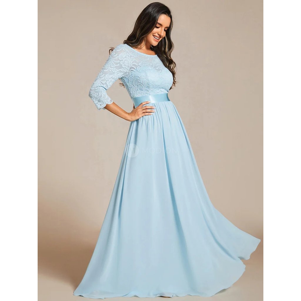 Modré společenské šaty dlouhé šifonové s krajkovými rukávy – Ever Pretty EP07412BL