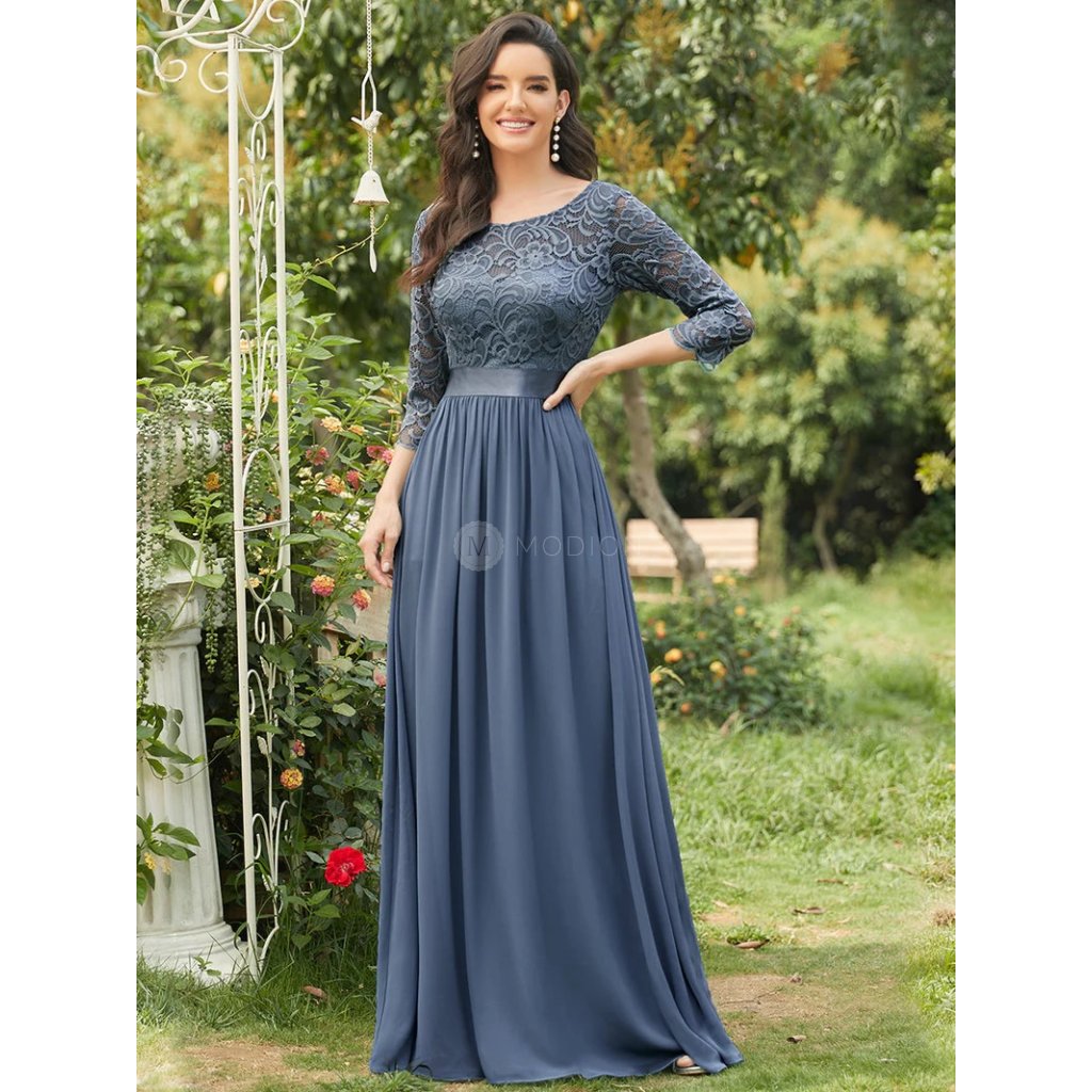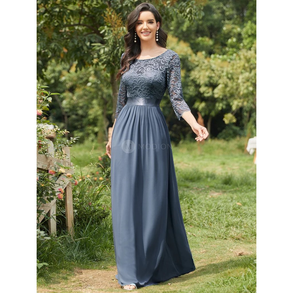 Modré společenské šaty dlouhé šifonové s krajkovými rukávy – Ever Pretty EP07412DN