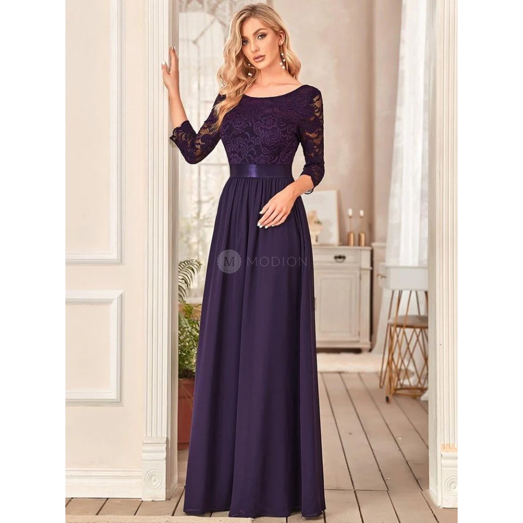 Tmavě fialové společenské šaty působí noblesně a sofistikovaně. Horní část tvoří jemná květinová krajka s vyztuženým živůtkem, který drží tvar a nabízí pohodlí i bez podprsenky. Tříčtvrteční rukávy a kulatý výstřih vpředu zajišťují decentní a elegantní vzhled. Záda jsou odhalená pod lopatky – jemný detail, který zvýrazní postavu. Pas je zdůrazněn všitým páskem v barvě šatů, který plynule přechází v dlouhou šifonovou sukni do áčka. Lehký materiál krásně splývá a reaguje na každý pohyb.