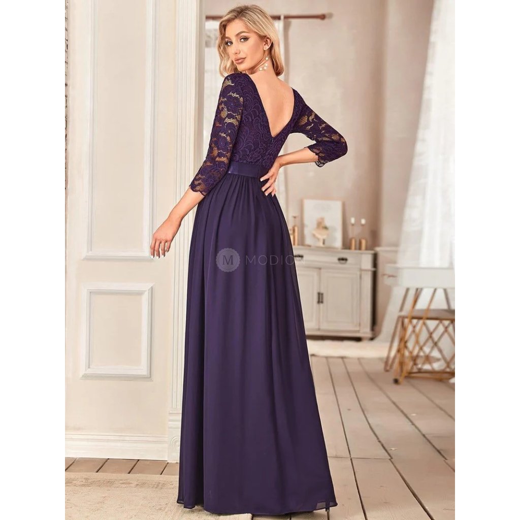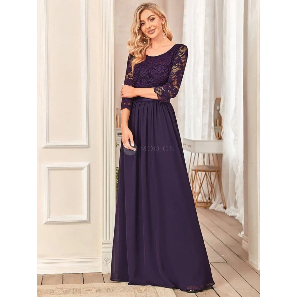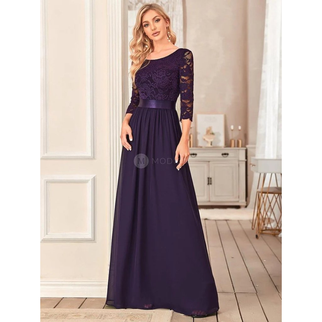 Dlouhé fialové společenské šaty v tmavě fialovém odstínu s krajkovým živůtkem a rukávy působí elegantně, slavnostně a velmi žensky. Sytý fialový tón dodává modelu hloubku a noblesní výraz, ideální pro večerní a reprezentativní společenské události.