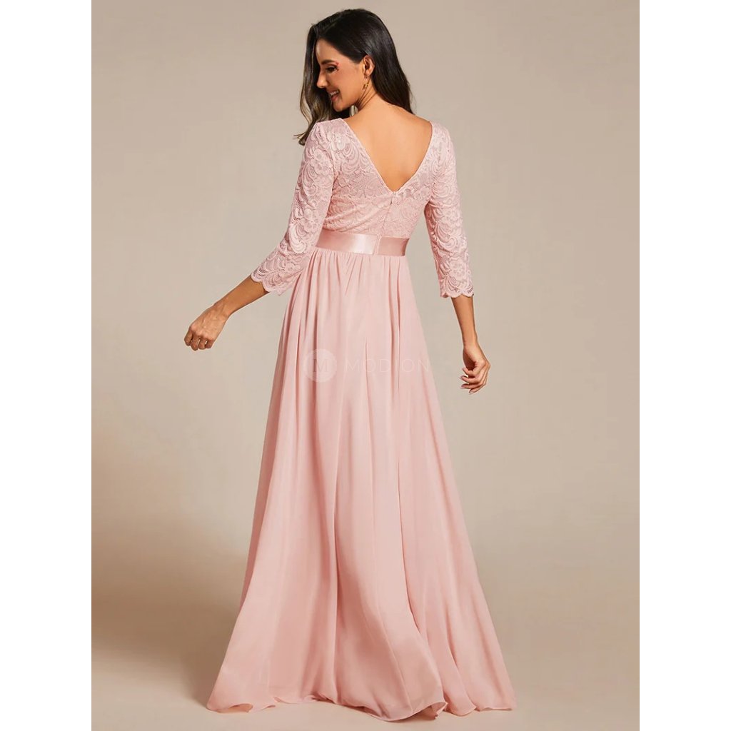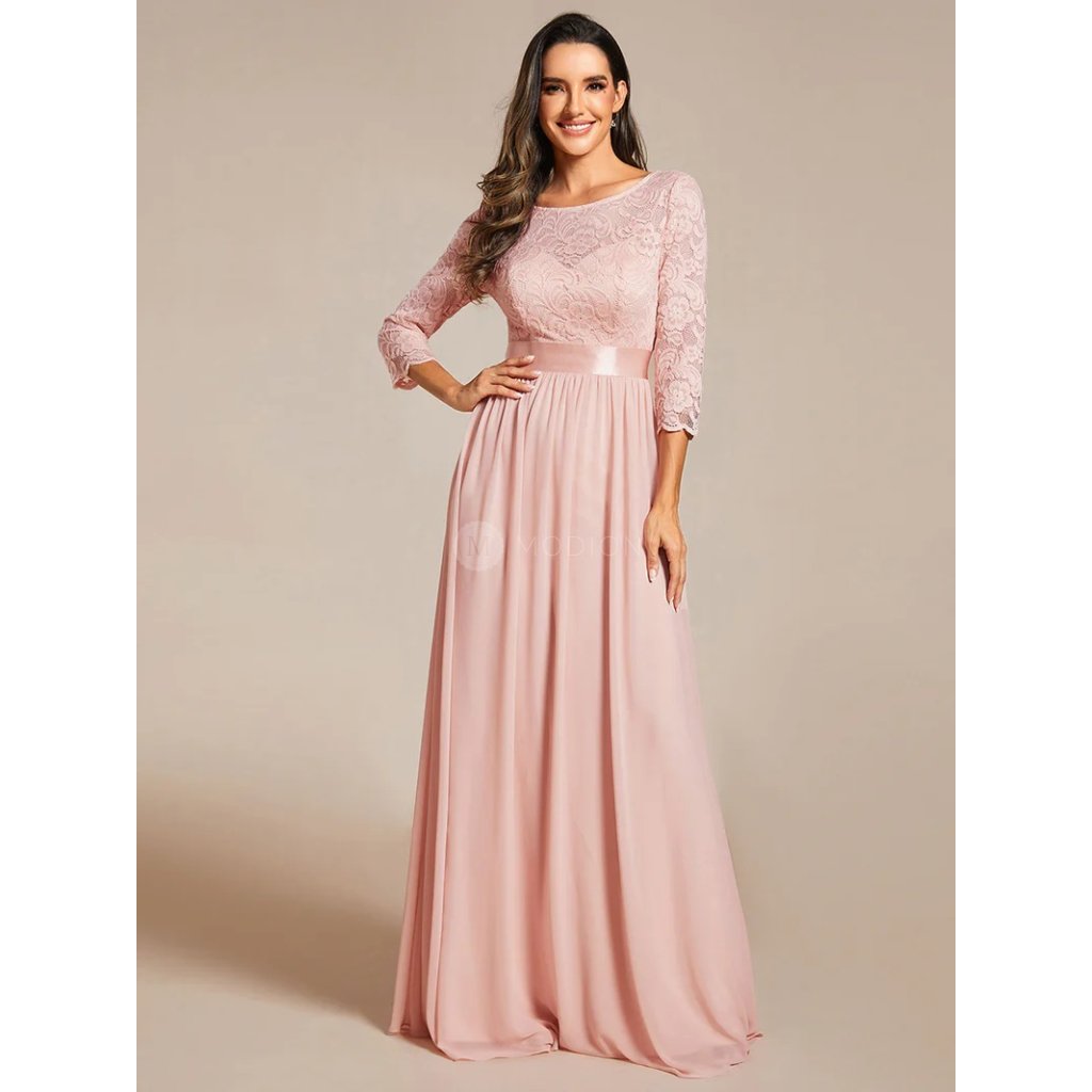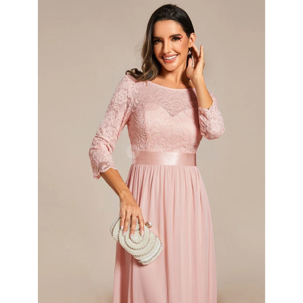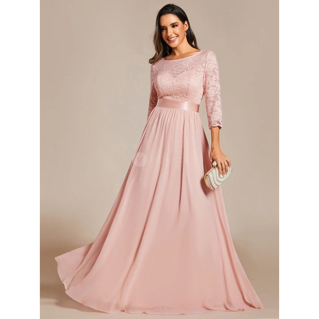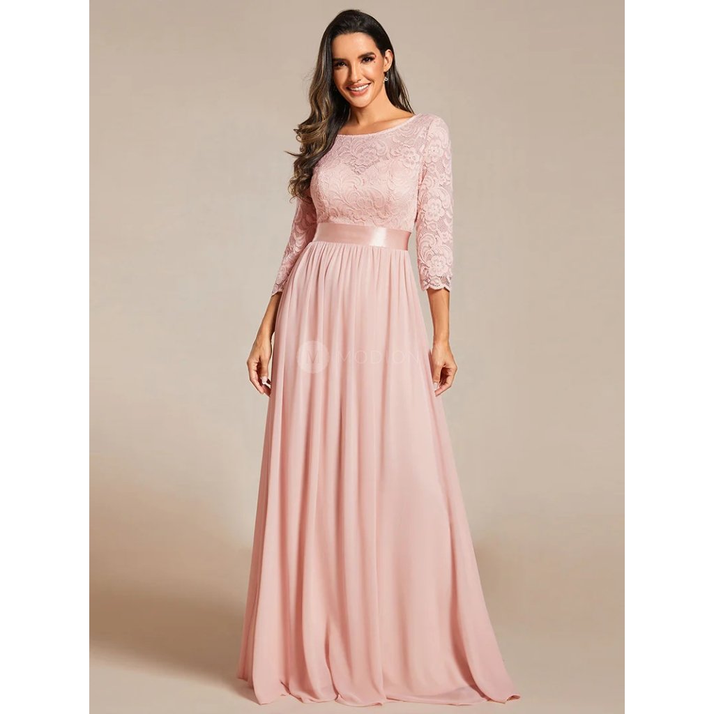 Dlouhé růžové společenské šaty v šifonovém provedení s krajkovými rukávy v jemném růžovém odstínu působí něžně, romanticky a velmi žensky. Světlý růžový tón dodává modelu lehkost a nadčasový slavnostní charakter vhodný pro denní i večerní společenské události.