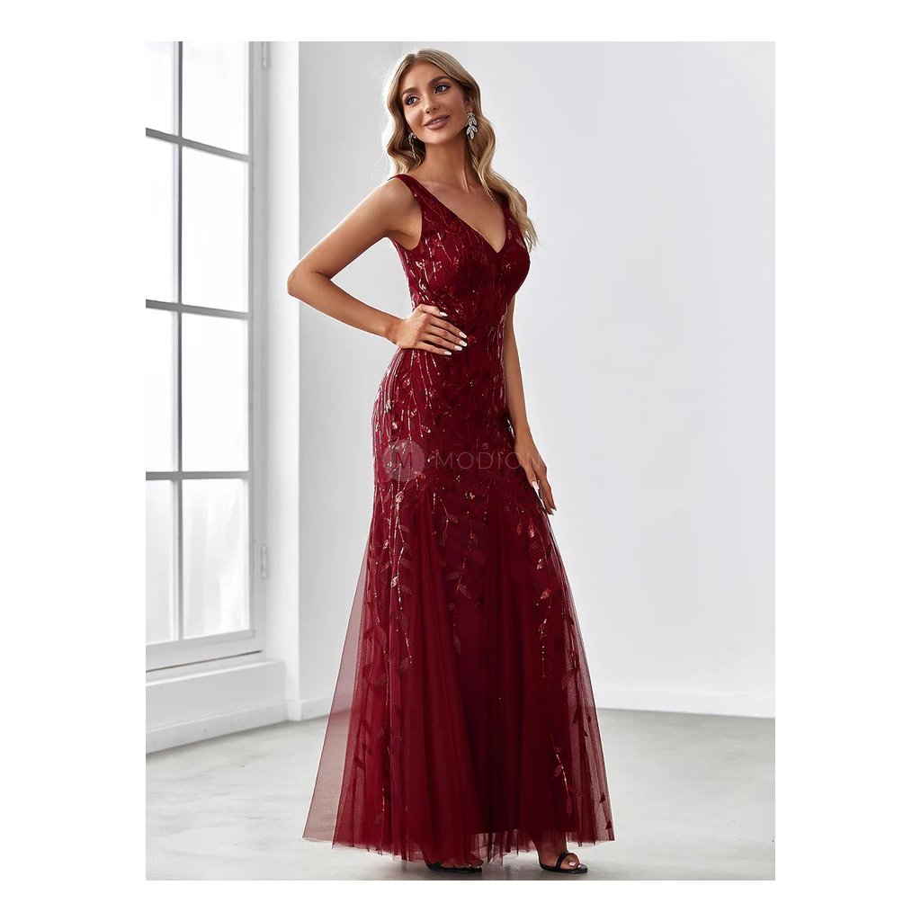 Vínové společenské šaty působí výrazně a elegantně. Výstřih do V a tenká ramínka zvýrazní dekolt i ramena, zatímco vypasovaný střih opticky zeštíhlí a podtrhne ženskou postavu. Rozšířená tylová sukně v délce až na zem dodává šatům noblesu a lehkost při pohybu. Celoplošné flitrové zdobení v tónu látky přidává šatům jedinečný třpyt, díky kterému budete zářit na maturitním plese, svatbě, galavečeru i významných společenských událostech.