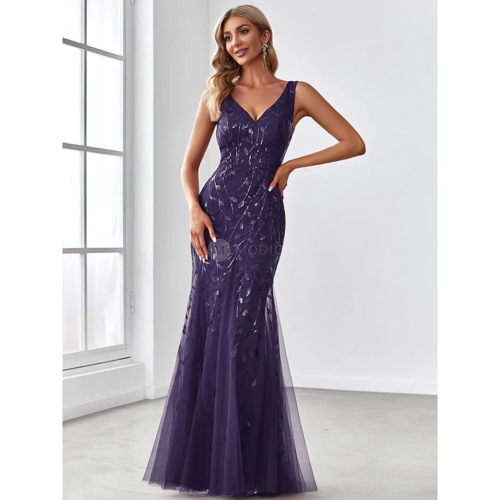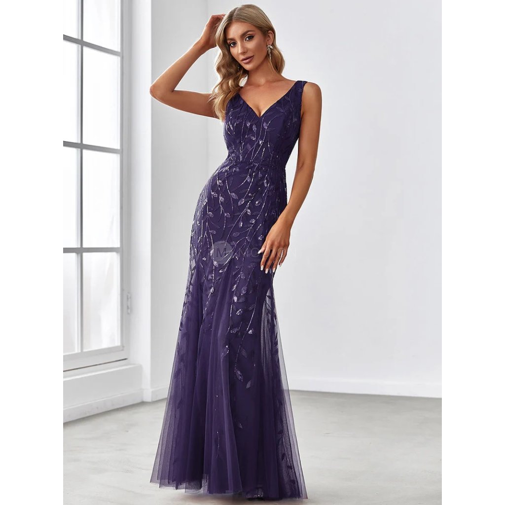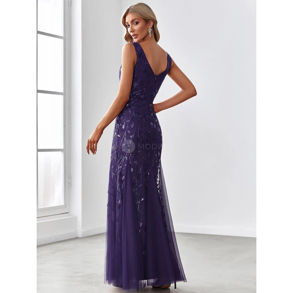 Fialové společenské šaty vynikají svou originalitou a půvabem. Hluboký výstřih do V a jemná ramínka působí svůdně a elegantně, zatímco vypasovaný střih krásně zvýrazňuje ženskou postavu. Dlouhá tylová sukně v áčkovém střihu dodává šatům lehkost a ladný pohyb. Celoplošné flitrové zdobení v tónu látky zajišťuje oslnivý třpyt, který přitahuje pozornost na každém kroku. Tyto šaty jsou ideální na maturitní ples, svatbu, galavečer i večerní slavnostní události.