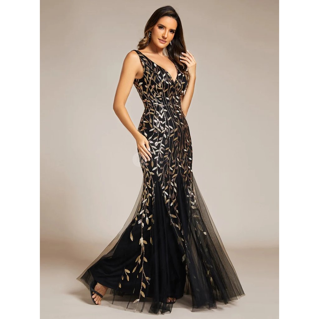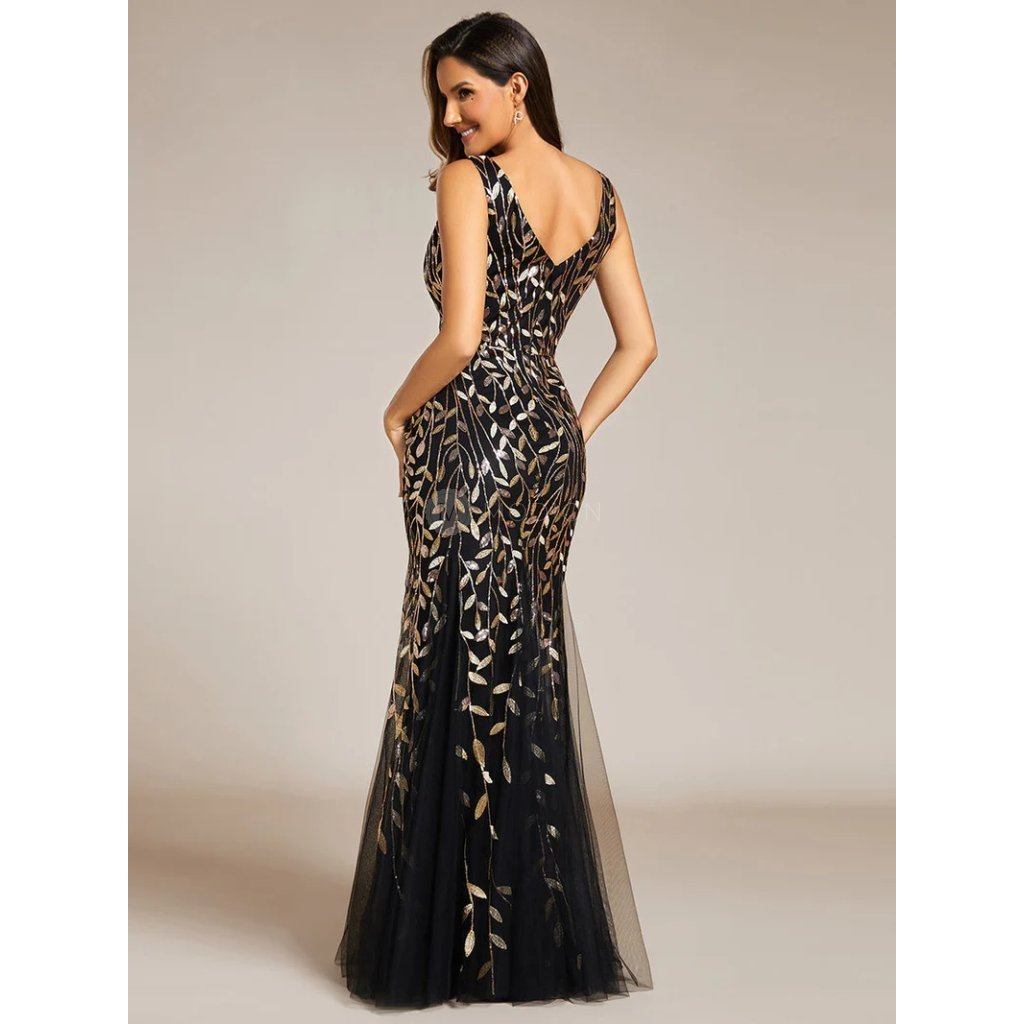 Jemný tyl s flitrovým zdobením dodává šatům třpytivý efekt, zatímco véčkový výstřih na ramínka a vypasovaný bodycon střih krásně zvýrazňují postavu. Kombinace černé barvy a zlatých detailů podtrhuje slavnostní charakter modelu a vytváří výrazný, ale stále vkusný večerní vzhled.
