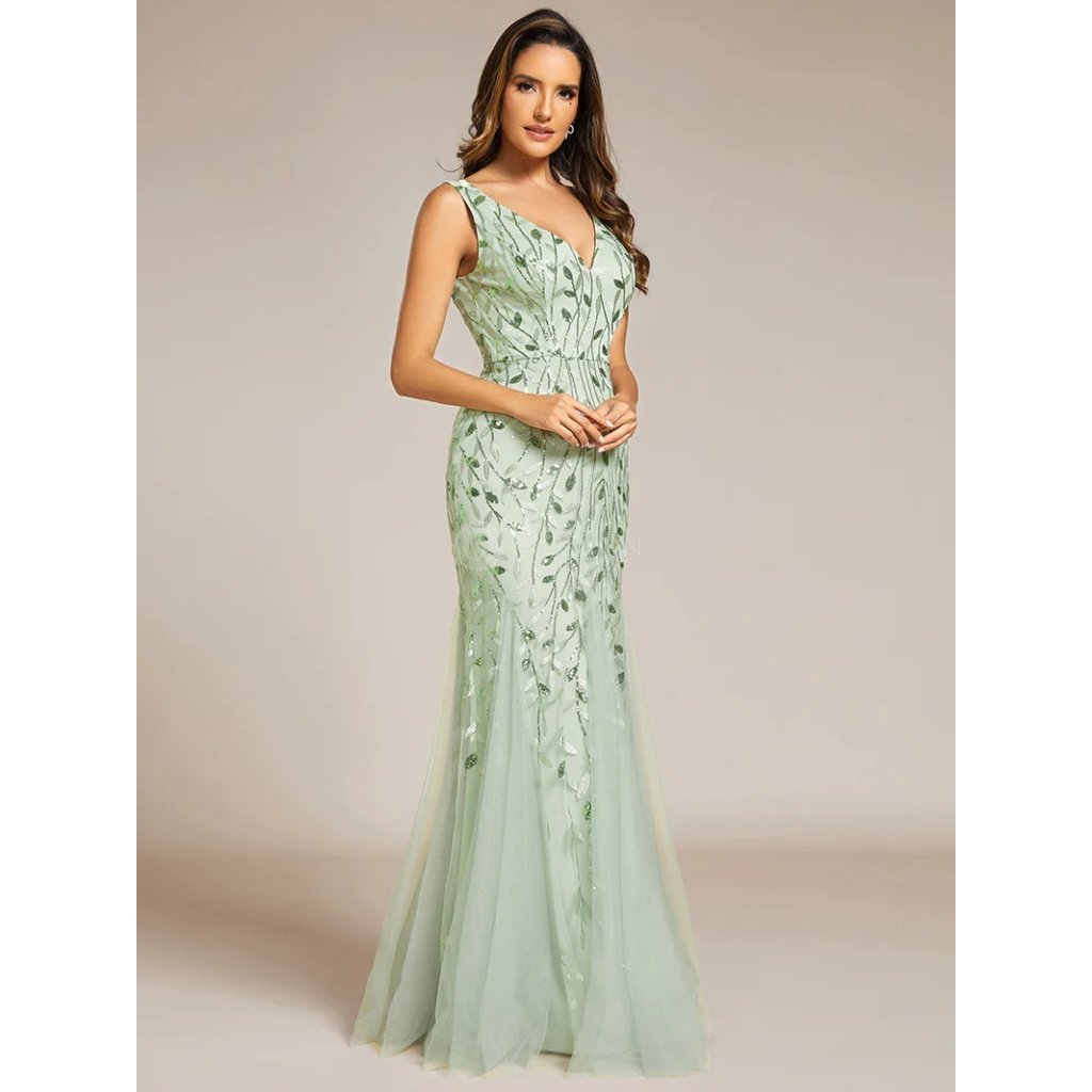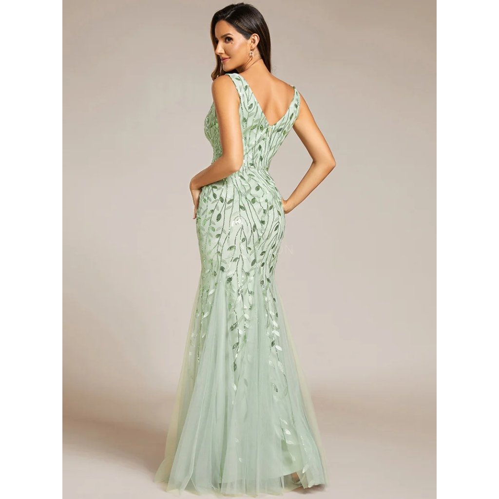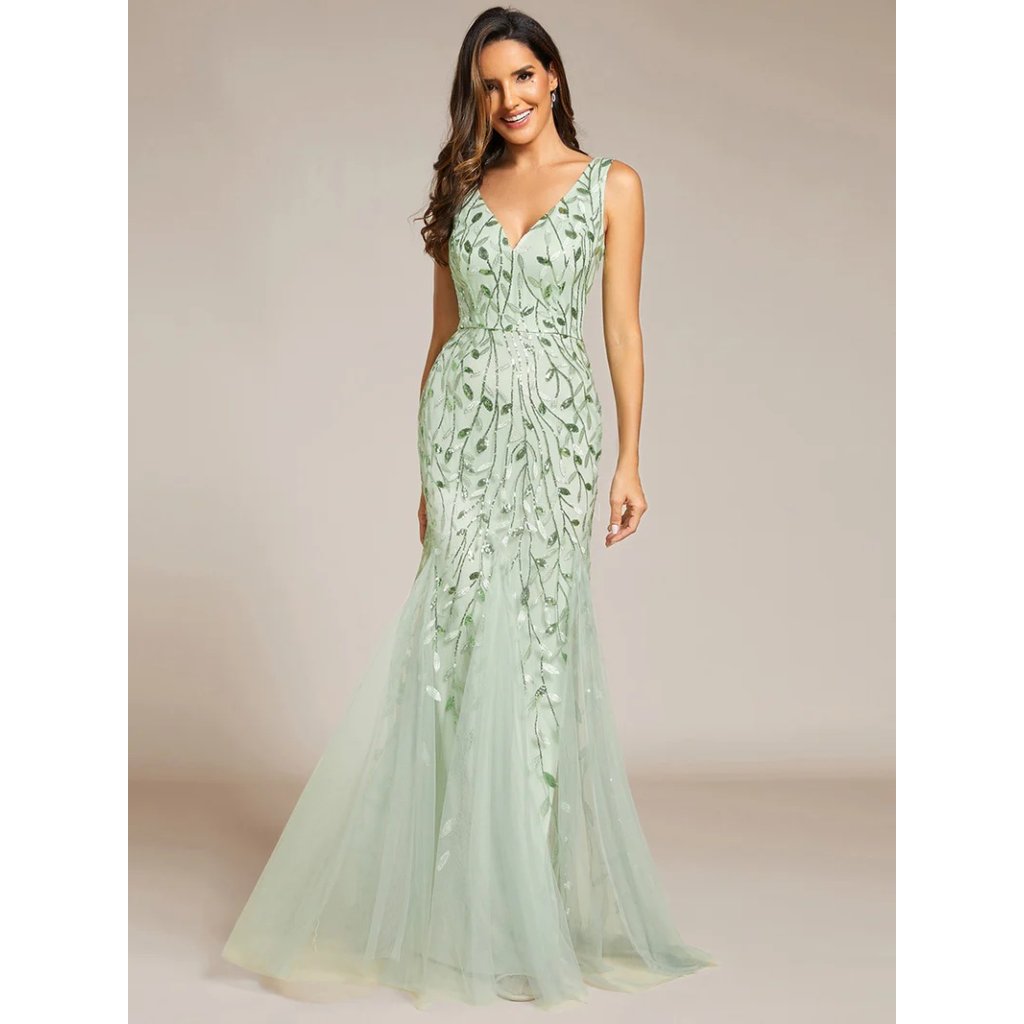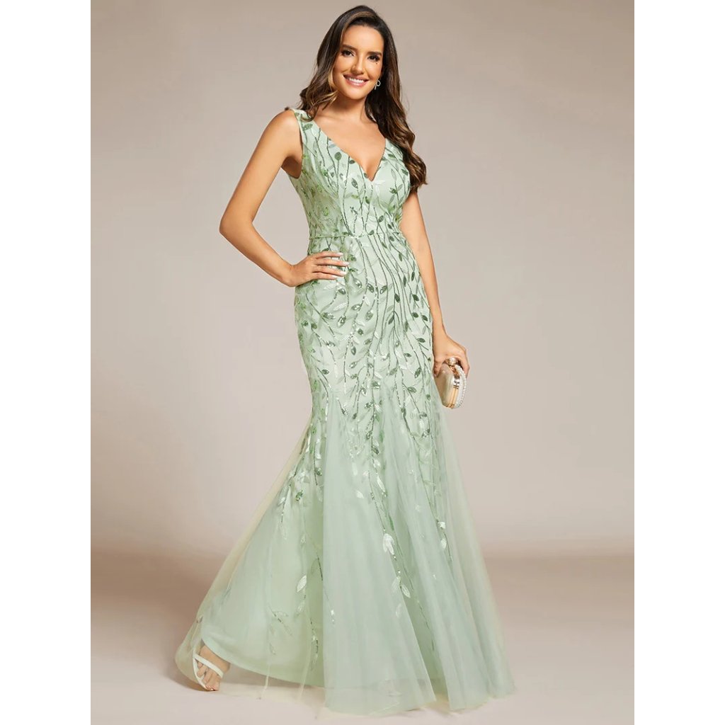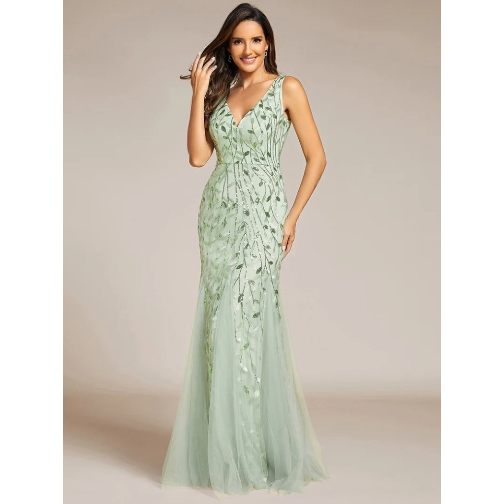 Mátové společenské šaty působí svěže a romanticky. Hluboký výstřih do V a jemná ramínka elegantně zvýrazní horní část postavy, zatímco vypasovaný střih podtrhne siluetu. Dlouhá tylová sukně v áčkovém střihu dodává modelu lehkost a ladný pohyb. Celoplošné flitrové zdobení v mátovém tónu látky vytváří oslnivý třpyt, díky kterému budete nepřehlédnutelná. Tyto šaty jsou ideální na maturitní ples, svatbu, galavečer i jiné významné společenské události.