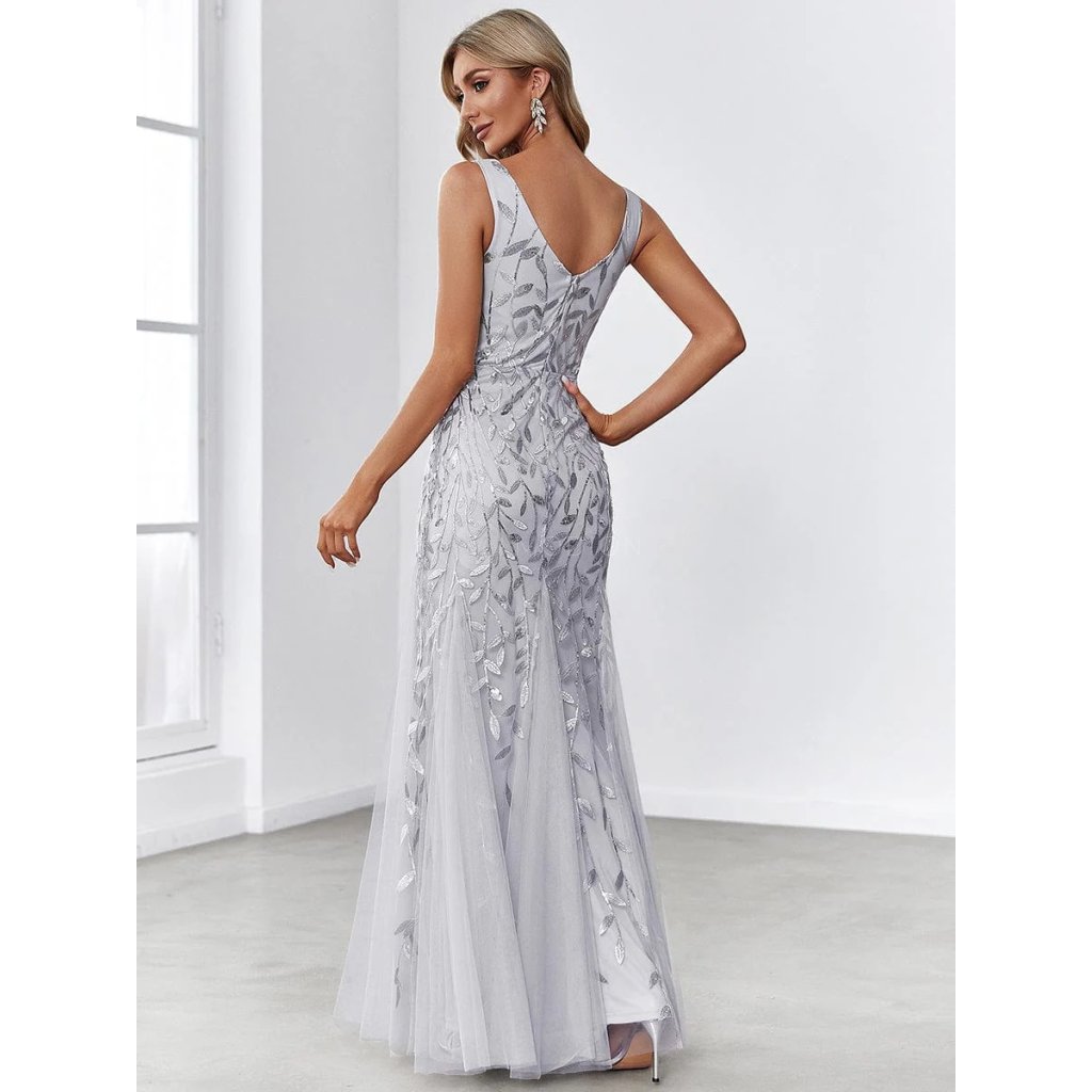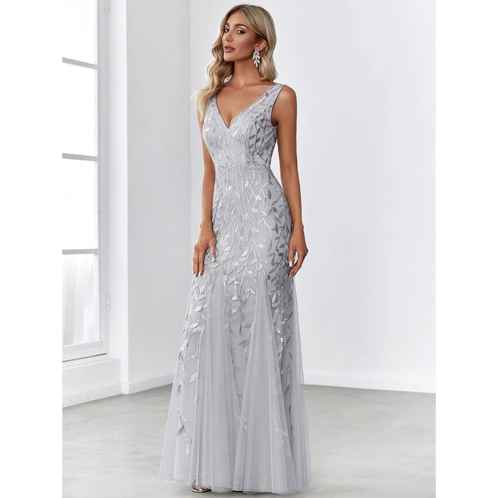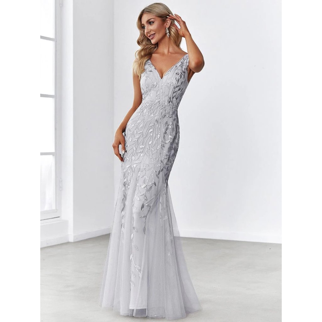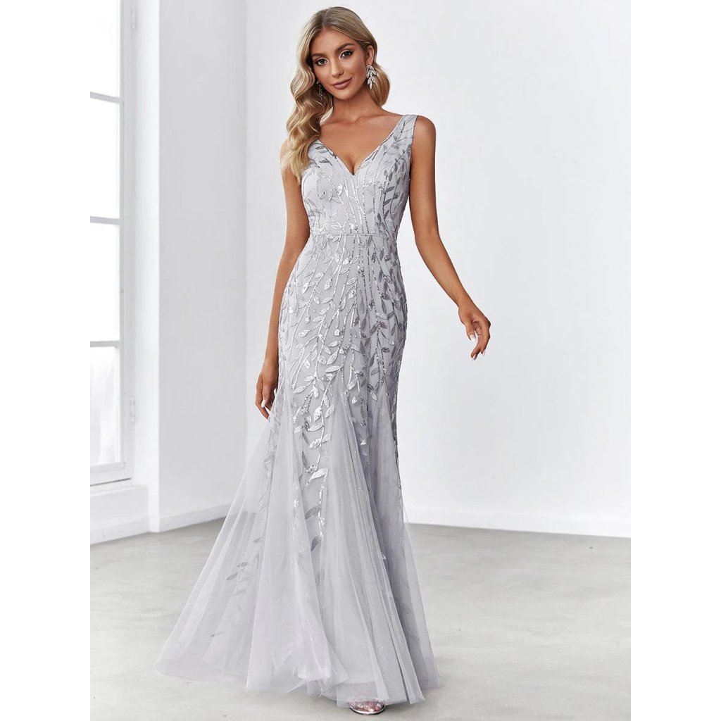 Stříbrné společenské šaty dlouhé tylové s flitry – Ever Pretty EP07886SV