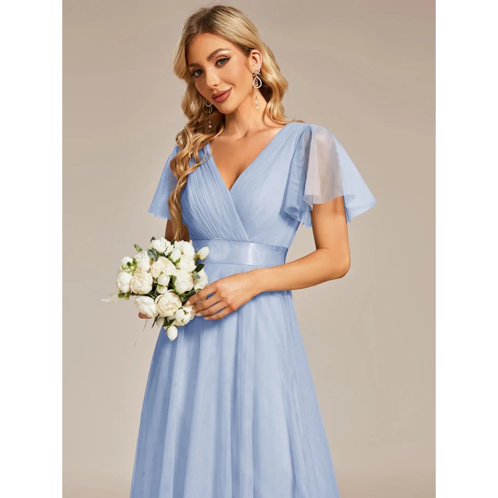 Modré společenské šaty působí luxusně, slavnostně a přitom jemně. Jsou ušité z lehkého tylu, který se při pohybu ladně vlní a dodává šatům vzdušnost. Áčkový střih lichotí postavě, výstřih do V opticky protahuje siluetu a krátké rukávy z jemného tylu decentně zakrývají paže. Splývavá áčková sukně umocňuje půvab a lehkost celého outfitu.